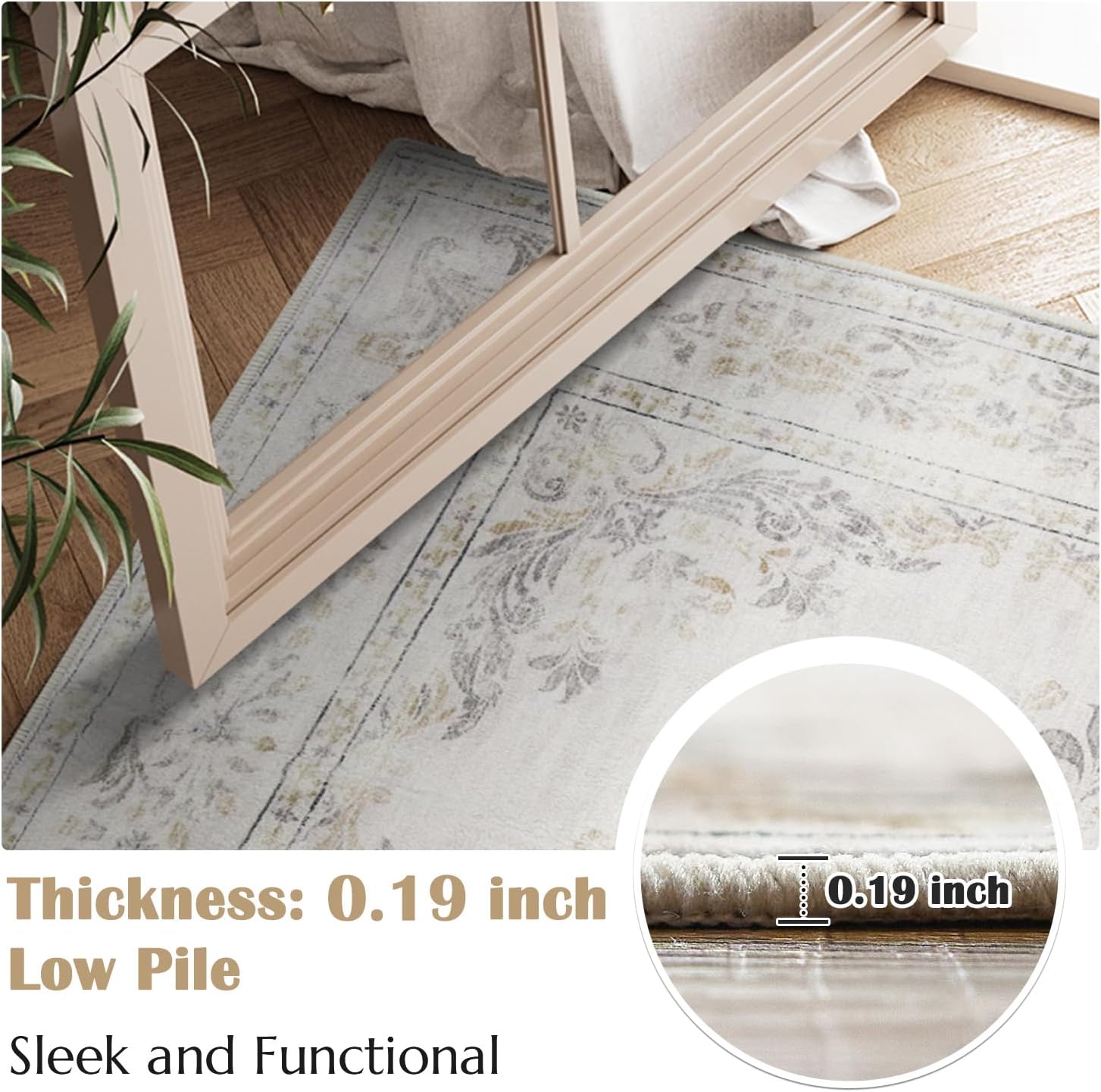 jinchan Hallway Runner Rug 2x8 Vintage Floral Distressed Design - Machine Washable Non-Slip Low-Pile Soft Thin Faux Wool Kitchen Carpet for Farmhouse Bedroom Laundry Room(2x8ft,Light Grey)