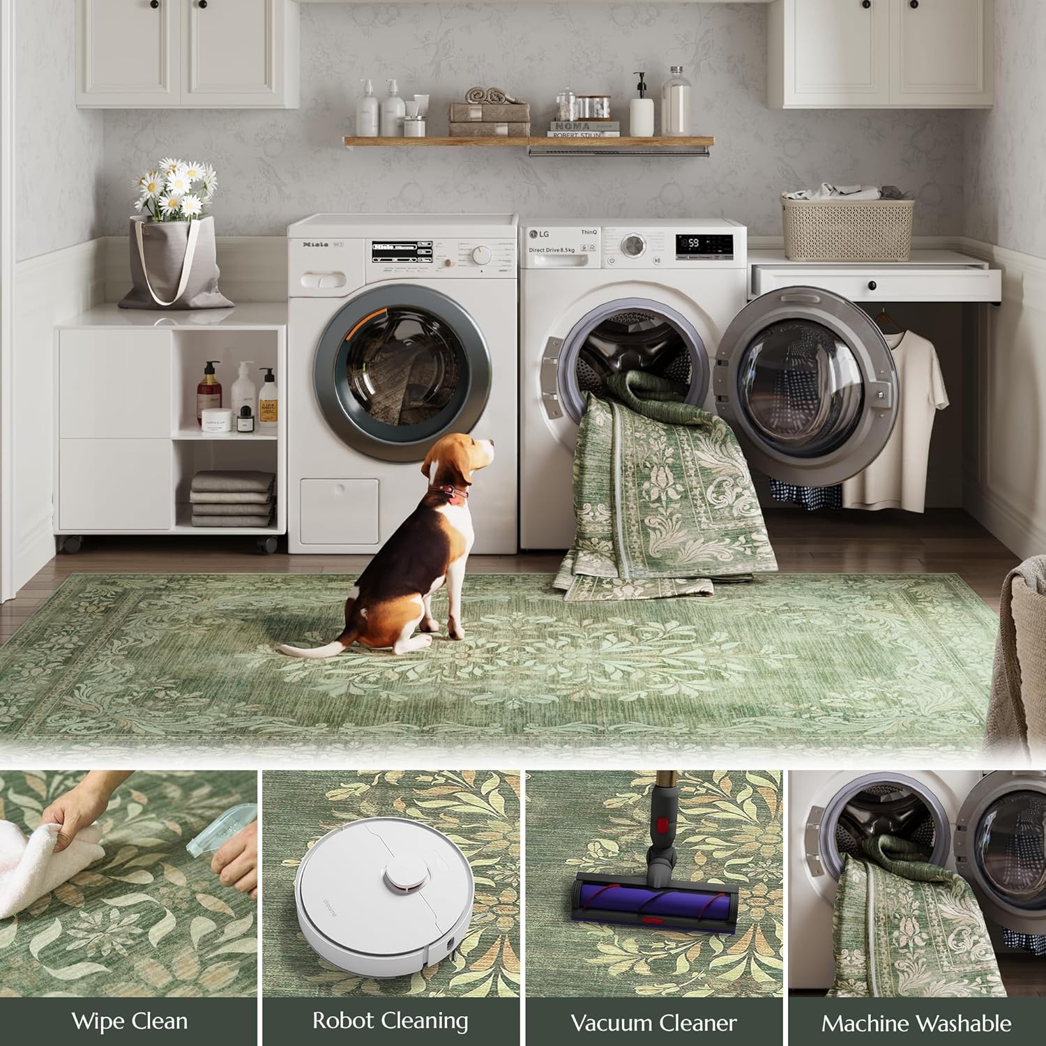 jinchan Vintage Floral Runner Rug 2x5 - Machine Washable Distressed Design Non-Slip Low-Pile Soft Thin Carpet for Hallway Kitchen Farmhouse Bedroom Entryway Laundry Room (2x5ft,Dark Green)