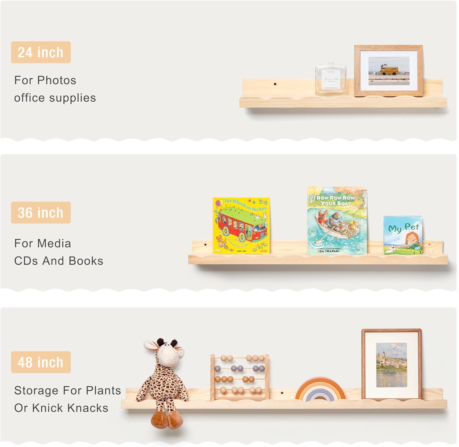 - ăPicture Ledge ShelvesăWith its effective wave design, these shelves reliably prevent items from falling off, providing a secure storage solution. You can easily organize your home space by placing picture frames, small plants, photo frames, books, toilet paper, bath towels, or decorations on these versatile shelves.