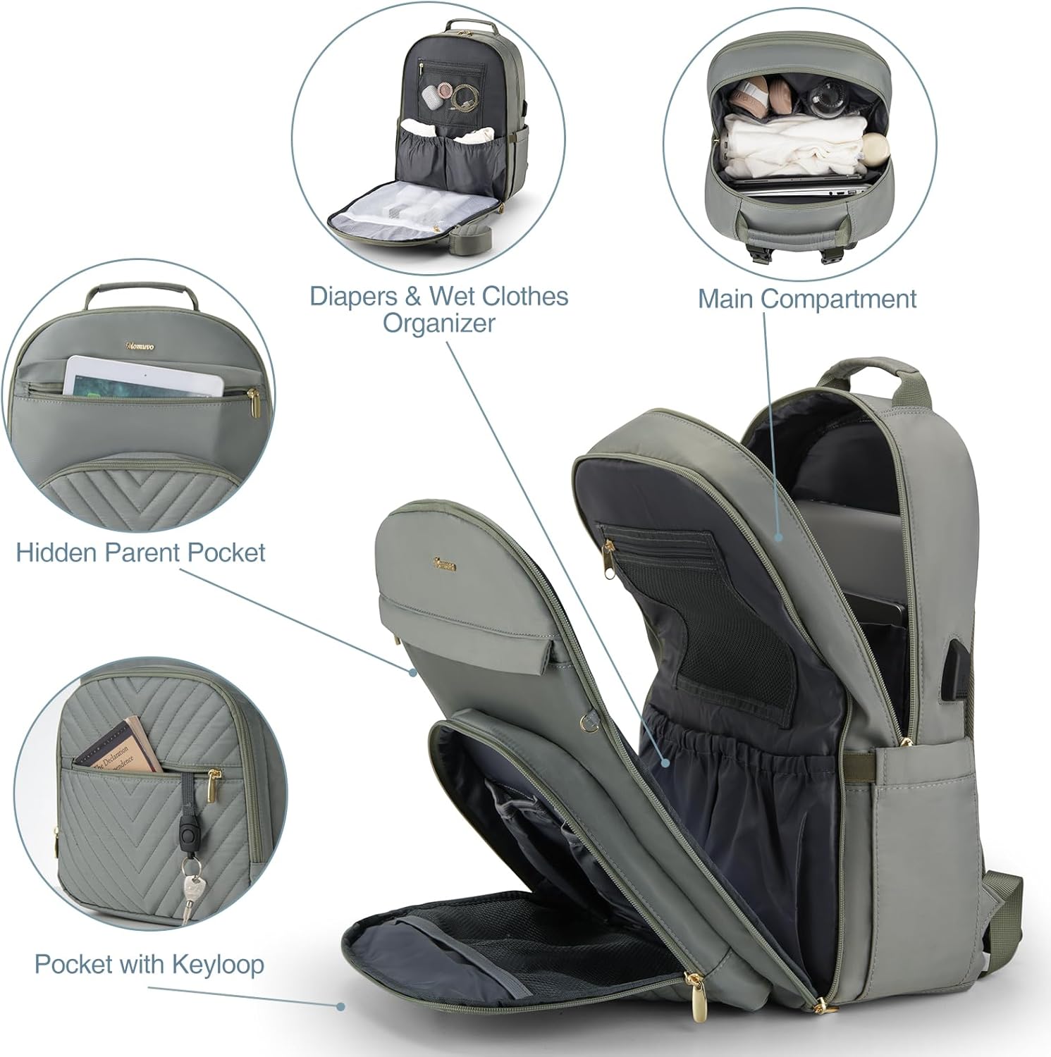 MOMUVO Diaper Bag Backpack, Quilted Baby Bag with Changing Pad & Stroller Straps & Pacifier Case, Multifunction Waterproof Travel Diaper Bags, Unisex, Olive Green