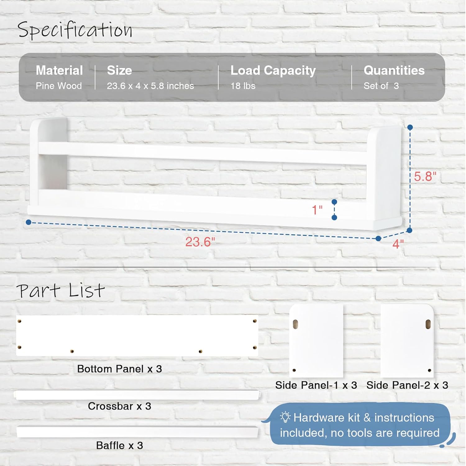 - [Premium Material and Easy to Install] These white nursery book shelves are made of solid pine wood (real pine) with advanced manufacturing processes. The package included all mounting hardware and a clear installation manual. You will easily be able to assemble those nursery wall shelves within minutes. The durable nursery shelves can hold up to 18 lbs.