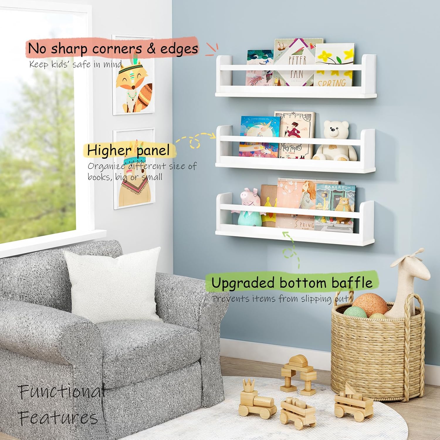 - [Perfect Wall Bookshelf for Kids Room] Without taking up any floor space, mount these floating kids bookshelves on your nursery wall or kids bedroom. Kids can easily place picture books, stuffed animals, and toys on wall shelving, where they'll be off the floor and easy to reach by themselves.