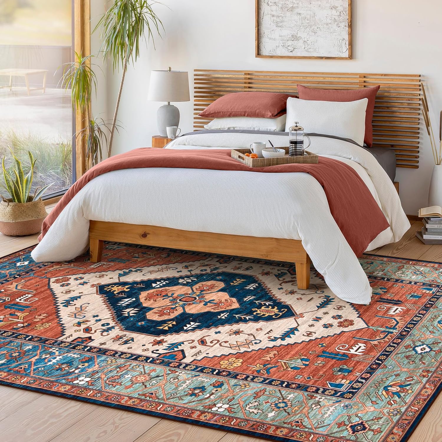 Lahome Area Rugs 9x12 Living Room - Boho Non-Slip Washable Rug Ultra-Thin Stain Resistant Large Carpet Throw Non Shedding Dining Room Mat, Oriental Print Carpet for Bedroom Guest Room (Rust, 9'x12')