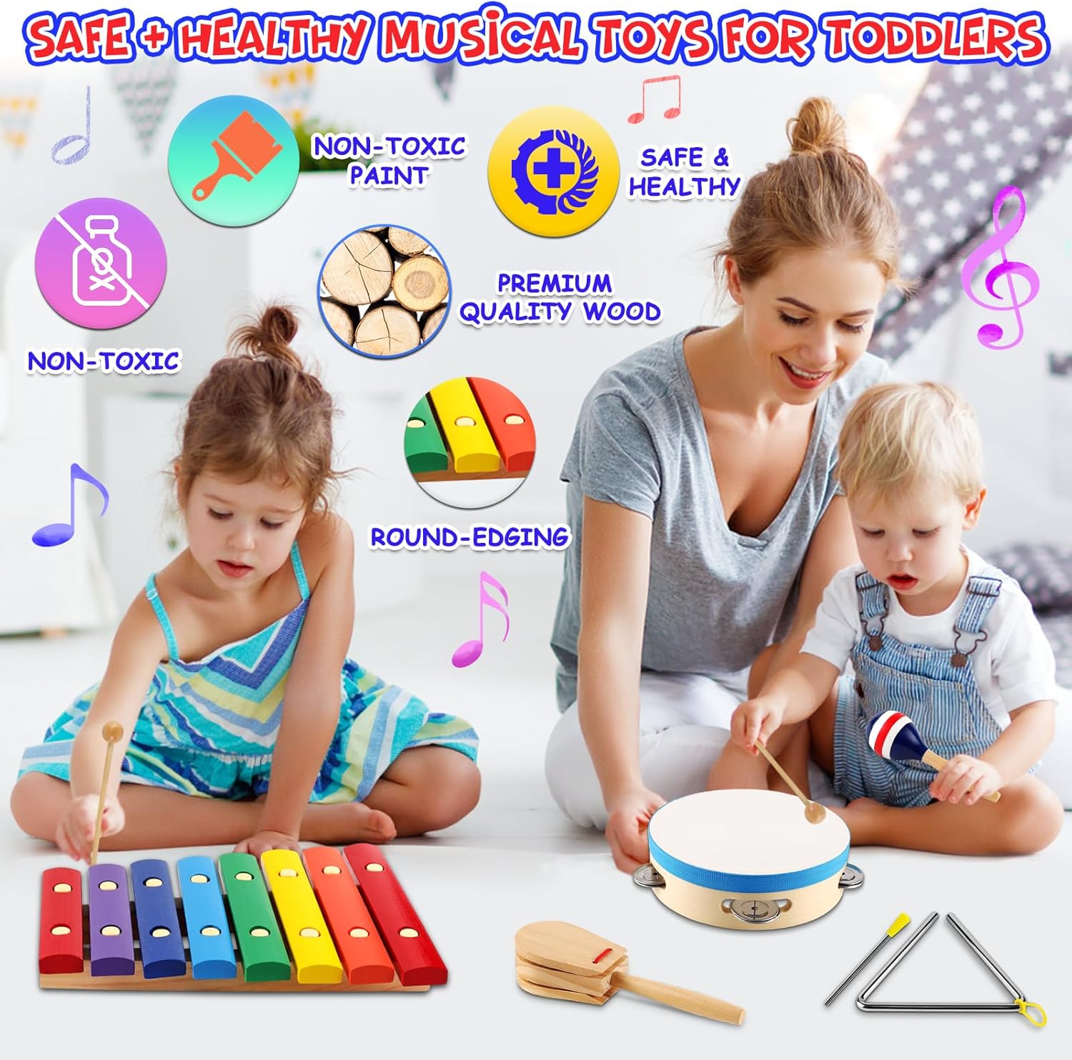 - 【Perfect Toddler Musical Instruments】: This kids musical instruments set including Xylophone, Tambourine,Maracas, Castanets and Triangle withe striker. These kids musical toys allows children to explore simple music concepts through creative play.