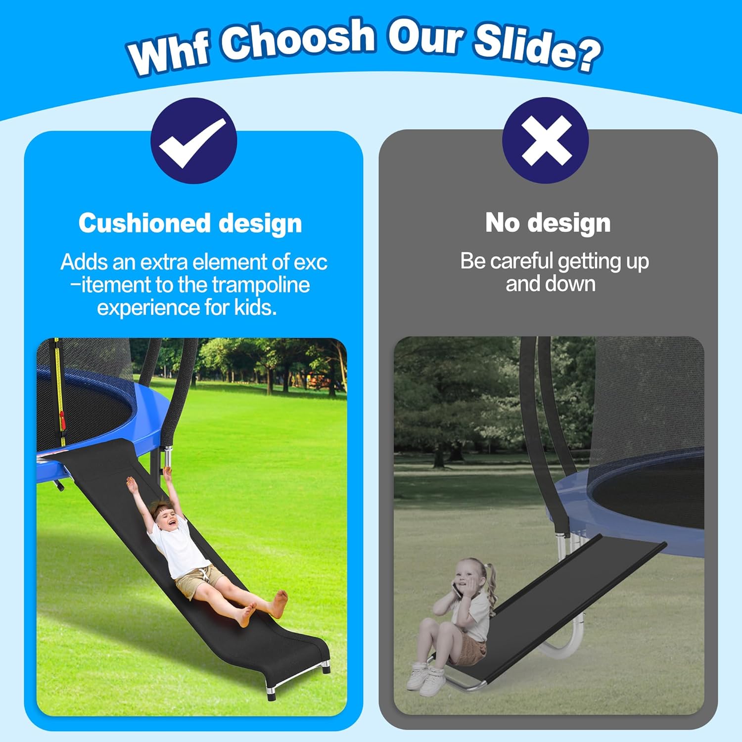 - 【KID-FRIENDLY DESIGN】Deomod trampoline stairs with 3 step design, perfect for children, allowing them to easily get on and off the trampoline without help. Three trampoline steps are designed to prevent child's feet from getting hurt and falling. Deomod kid slide trampoline slide is cushioned so that your child's hips won't land on the ground when sliding down, providing security for your child's safety. Universal trampoline slide attachment as trampoline toys will give your kids endless fun