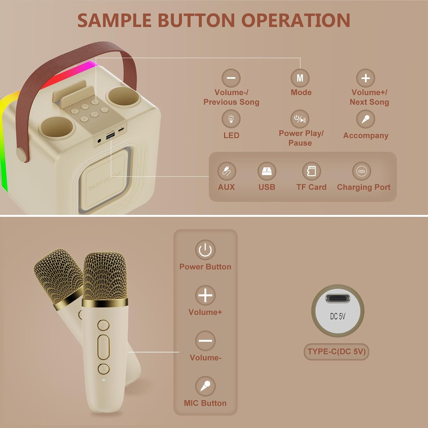- Included Components : 1 * Karaoke Machine with Mics Storage Hole, 2 * Rechargeable Wireless Mics, 2 * Type-C Charging Cable, Auxiliary Cable, User Manual 1 * Karaoke Machine with Mics Storage Hole, 2 * Rechargeable Wireless Mics, 2 * Type-C Charging Cable, Auxiliary Cable, User Man… See more