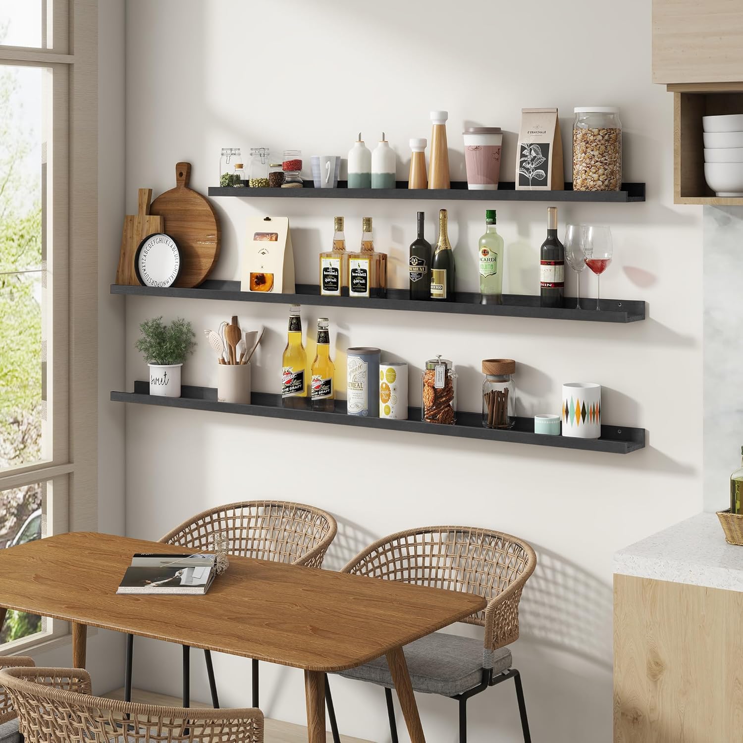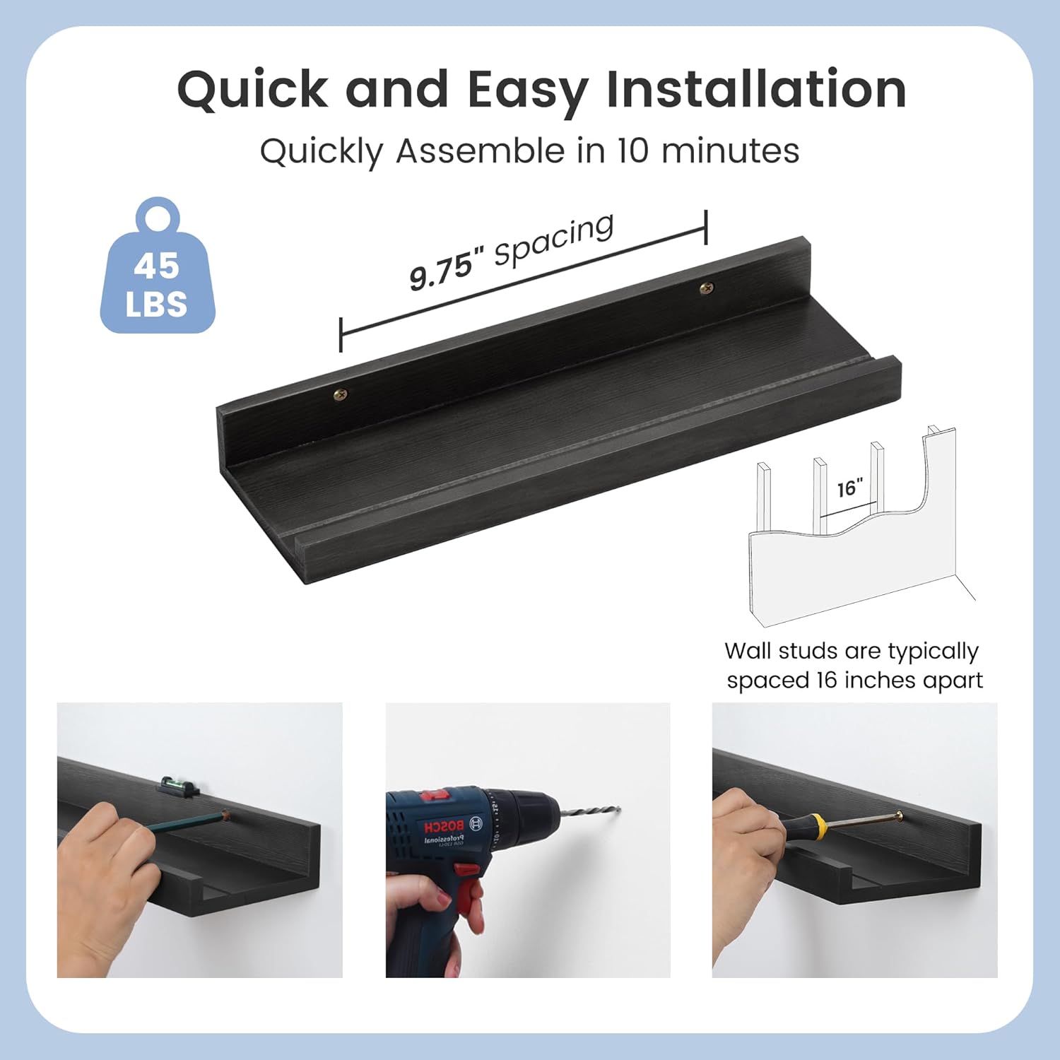 Picture Ledge Shelf for Wall, 16 inch Solid Pine Wood Nursery Book Shelves 2 Packs, Floating Ledge Shelves for Kids' Room Bedroom Bathroom Living Room Photo Frames Office Nursey Wall Decor, Black