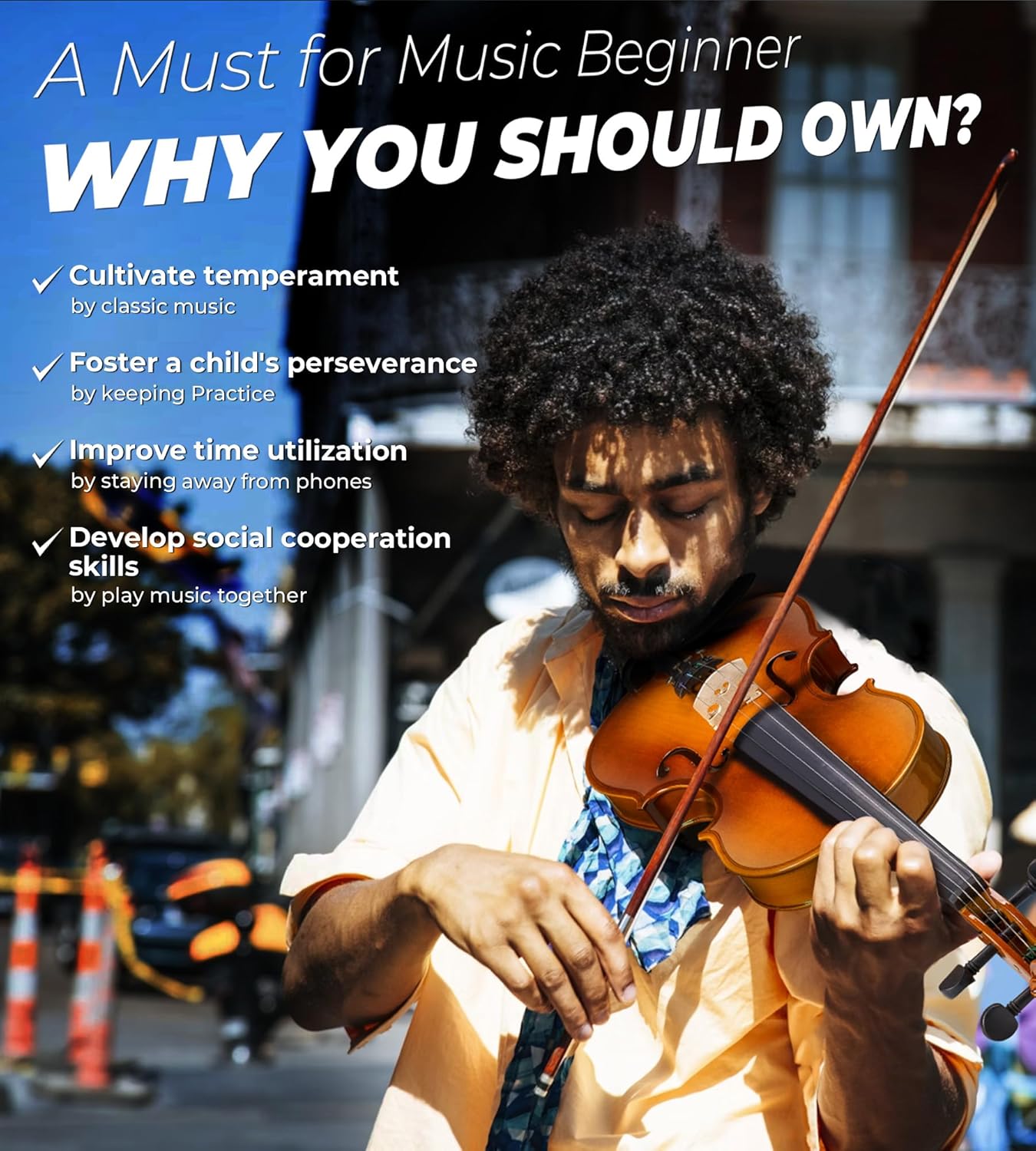 - Beginner-friendly? We have offered you fingerboard sticker for better locating precise phoneme, more accessories than your regular use, in case that you don't know where to play and have no time for buying any violin 4/4 full set accessories. Bedsides, included mute enables you to play in a lower voice without getting into any trouble from neighbors. Just immerse yourself in a full band & orchestra musical instruments world.