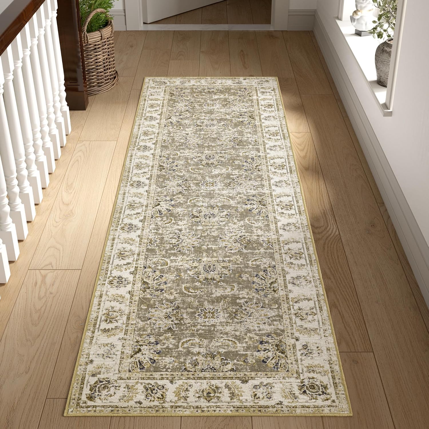 jinchan Runner Rug 2x6 Washable Hallway Runner - Vintage Floral Non Slip Low-Pile Soft Thin Kitchen Rug Distressed Carpet for Farmhouse Bedroom Entryway Laundry Room(2x6ft,Taupe)