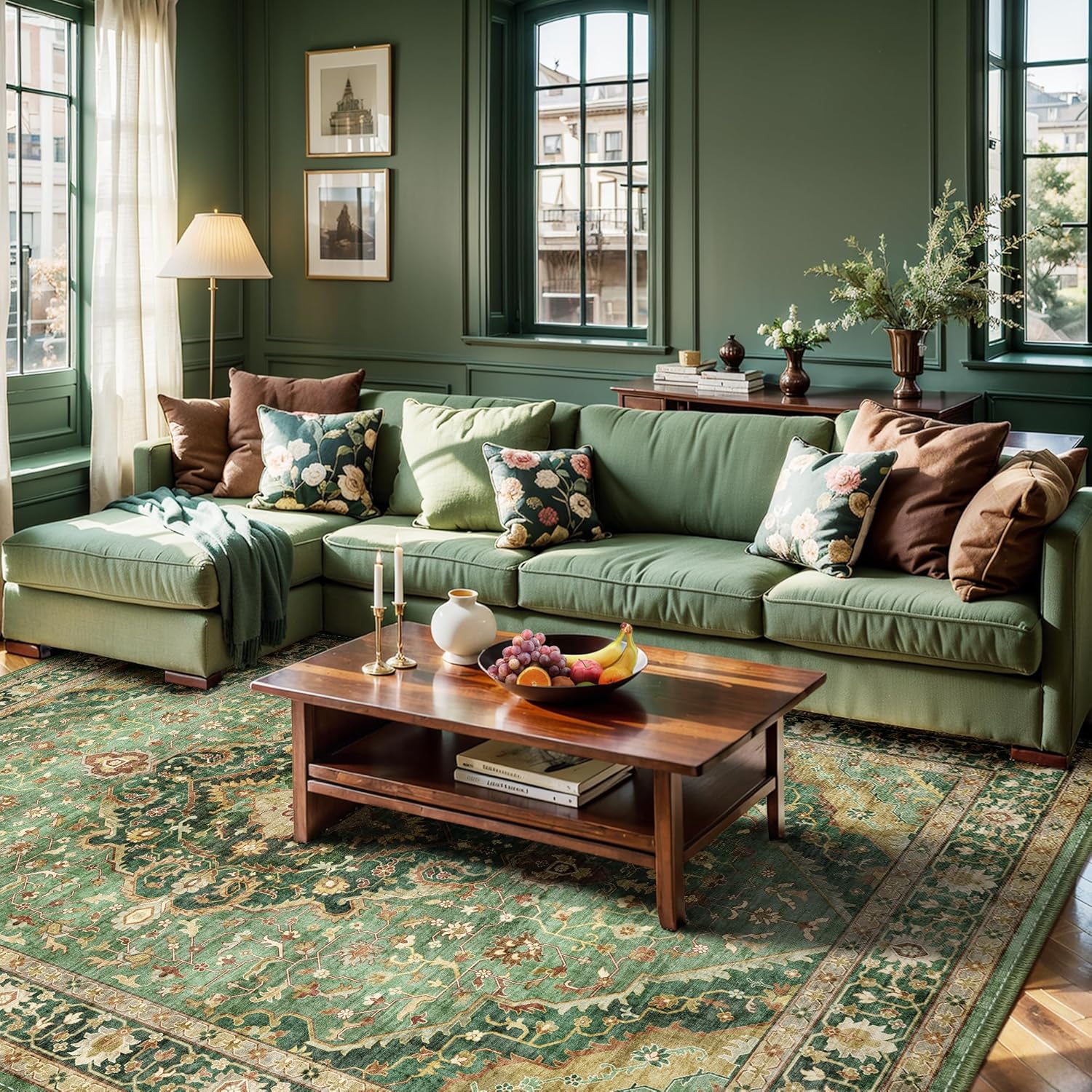 Green Rugs for Living Room - Boho 4x6 Area Rug Ultra Soft Vintage Rugs for Bedroom Playroom Decor, Low Pile Non-Slip Backing Throw Rugs Washable (Border Green