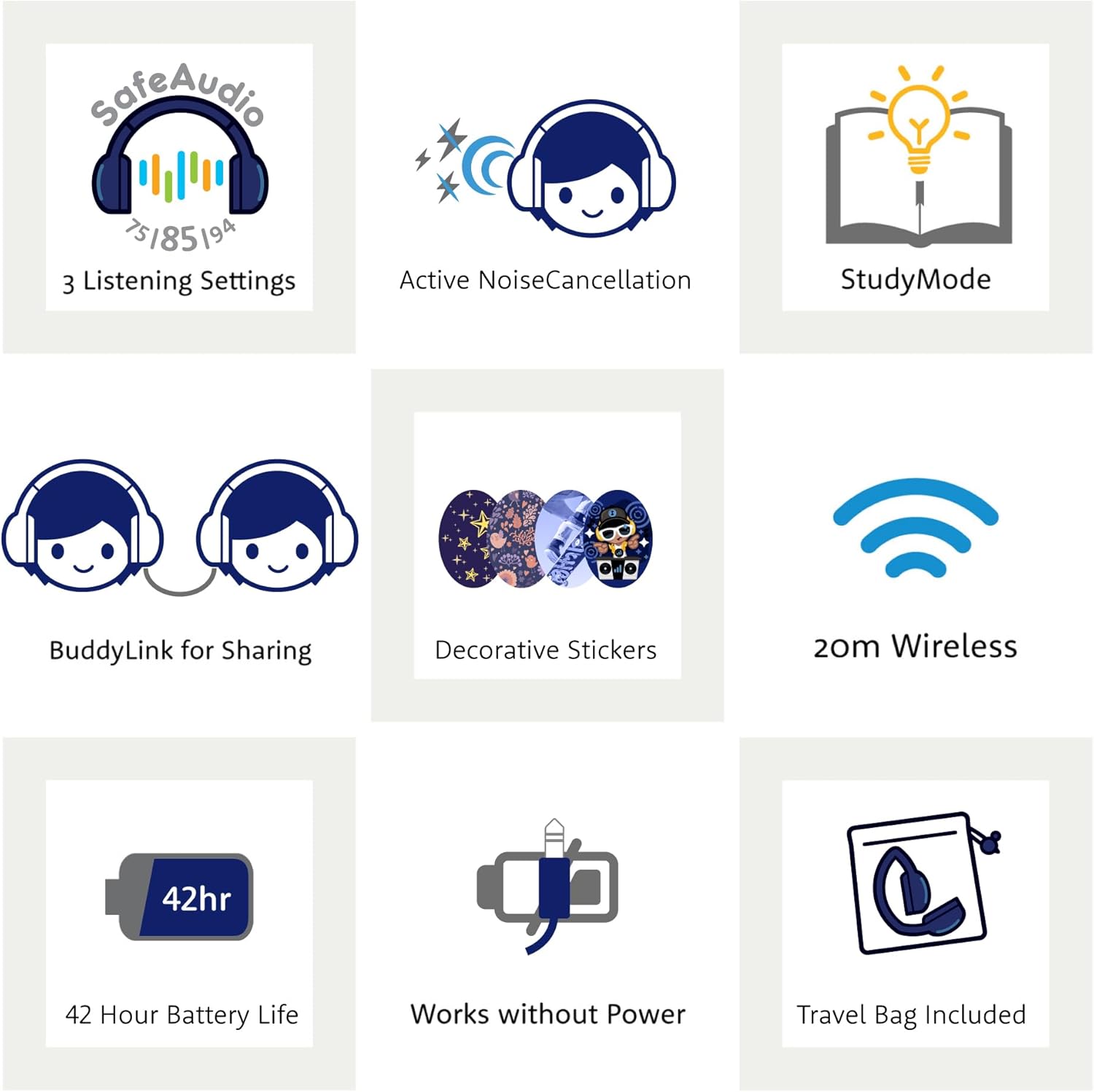 - KEY FEATURES: BuddyPhones CosmosFun ANC headphones offer three safe audio listening modes: TravelMode (maximum 94dB), KidsMode (85dB), and ToddlerMode (75dB). The dual connection feature offers both wireless and wired use, so kids can continue using for videos or music even when the battery runs low. Comfortable over ear cups are engineered with hypoallergenic, durable materials comfortable for toddlers to big kids. A 42hr battery, travel bag and included cables make CosmosFun the perfect travel headset.