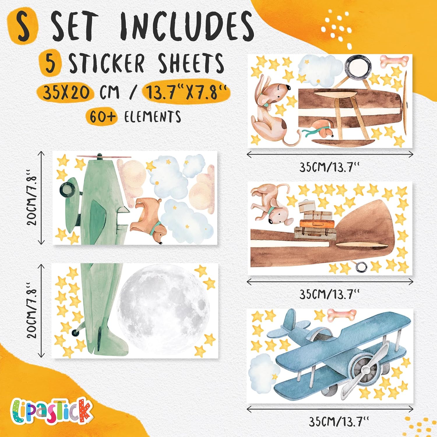 - โ๏ธ Package Content: Airplane classroom decor comes in a pack of 5 sheets. Includes: airplane, stars, dogs and clouds. The sheet size is 13.8" x 7.8". This set of airplane decals for boys room is size S.