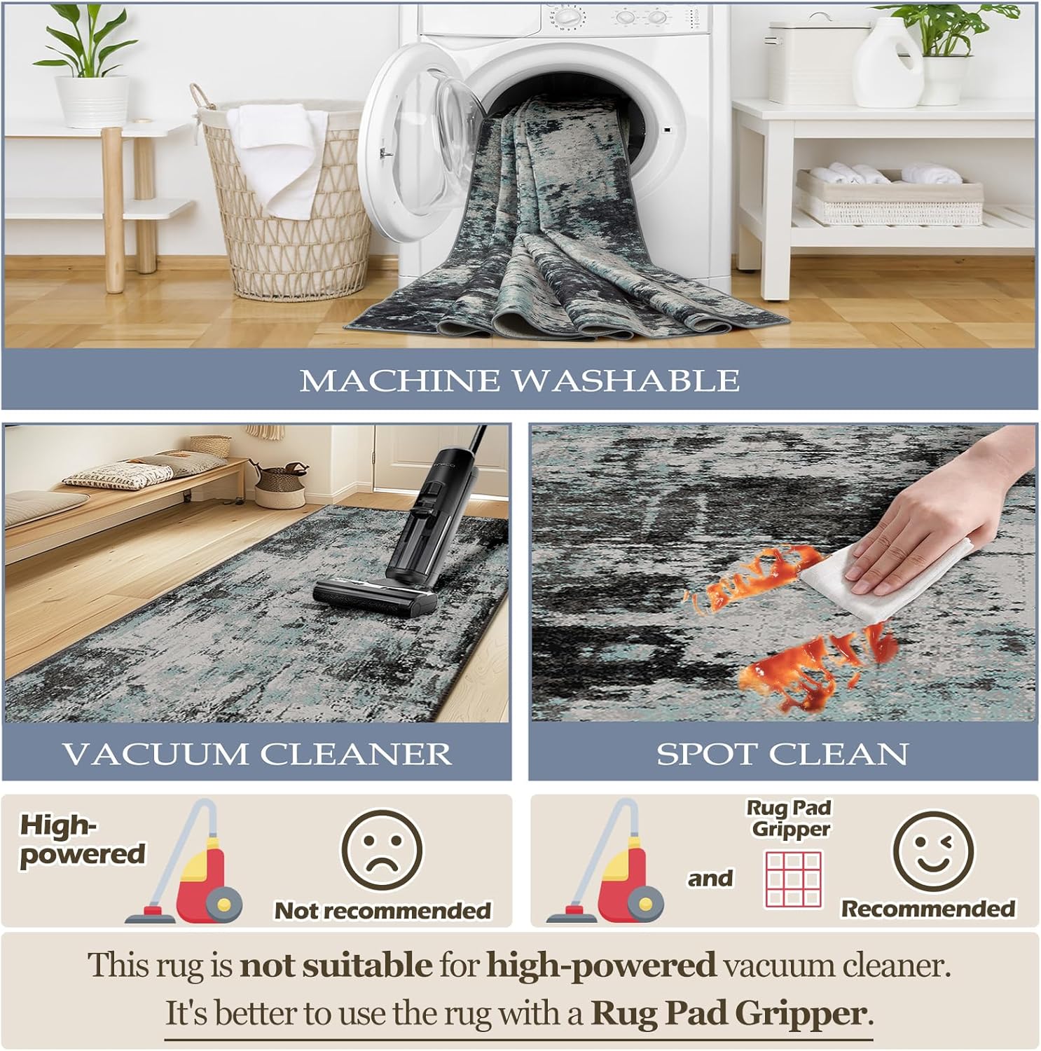 - Tides Series โ Effortless style that flows with your life.This modern machine-washable non-slip rug features reinforced edges and a low-pile design that resists dirt. Its water-repellent surface makes spills easy to clean - liquids bead up for quick wiping. Simply machine wash in cold water (no bleach) to refresh. The non-slip backing keeps it securely in place. A perfect blend of function and contemporary design for active homes.