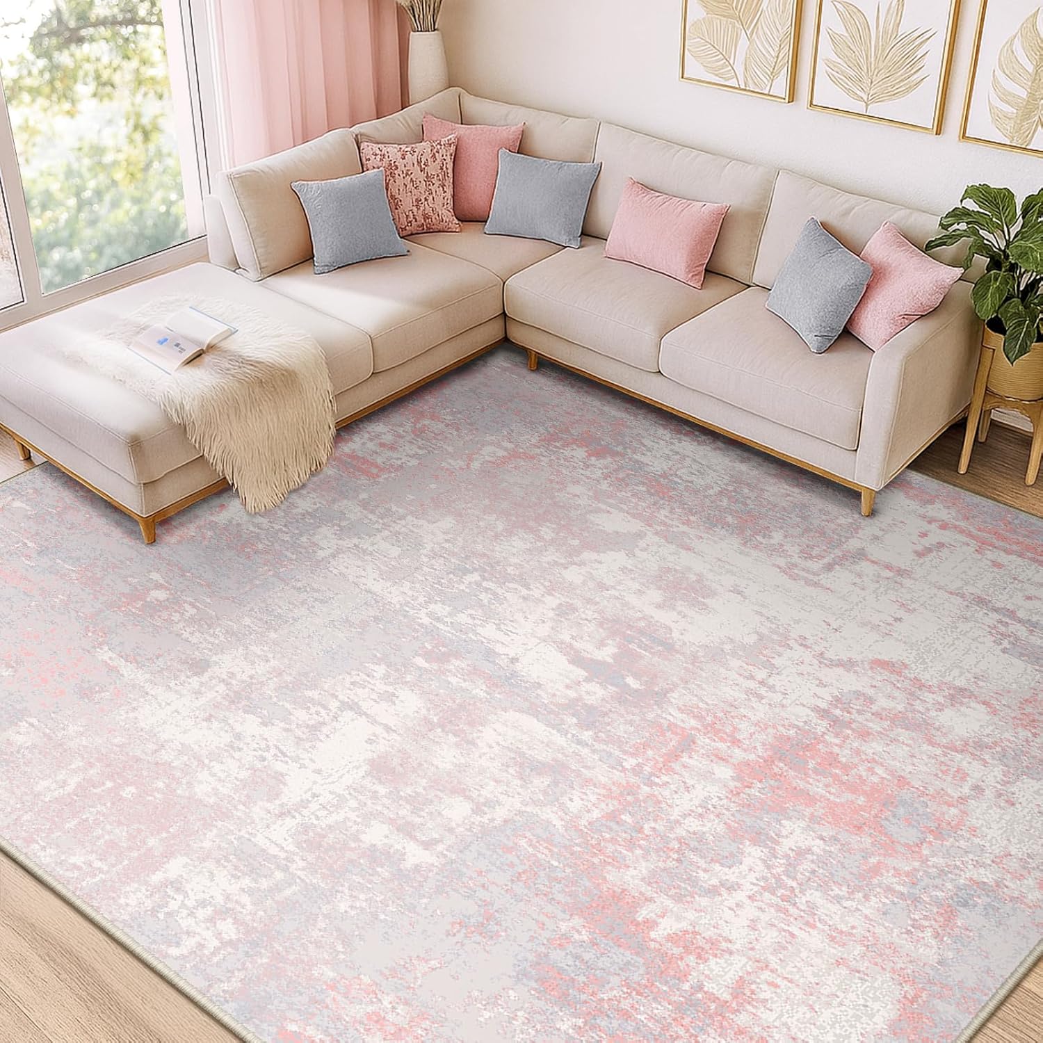 Washable Area Rugs 9'x12' Non-Slip Modern Abstract Soft for Living Room Entryway Bedroom Nursery, Print Pattern, Grey Pink