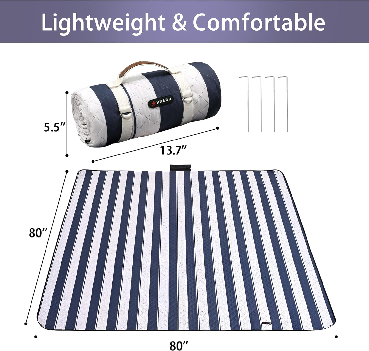HX&OD Outdoor Picnic Blanket Extra Large, 80''*80'' Waterproof Picnic Mat with Stakes Foldable Camping Blanket Portable with Carry Strap for Beach Mat (Blue& White, 80''*80'')