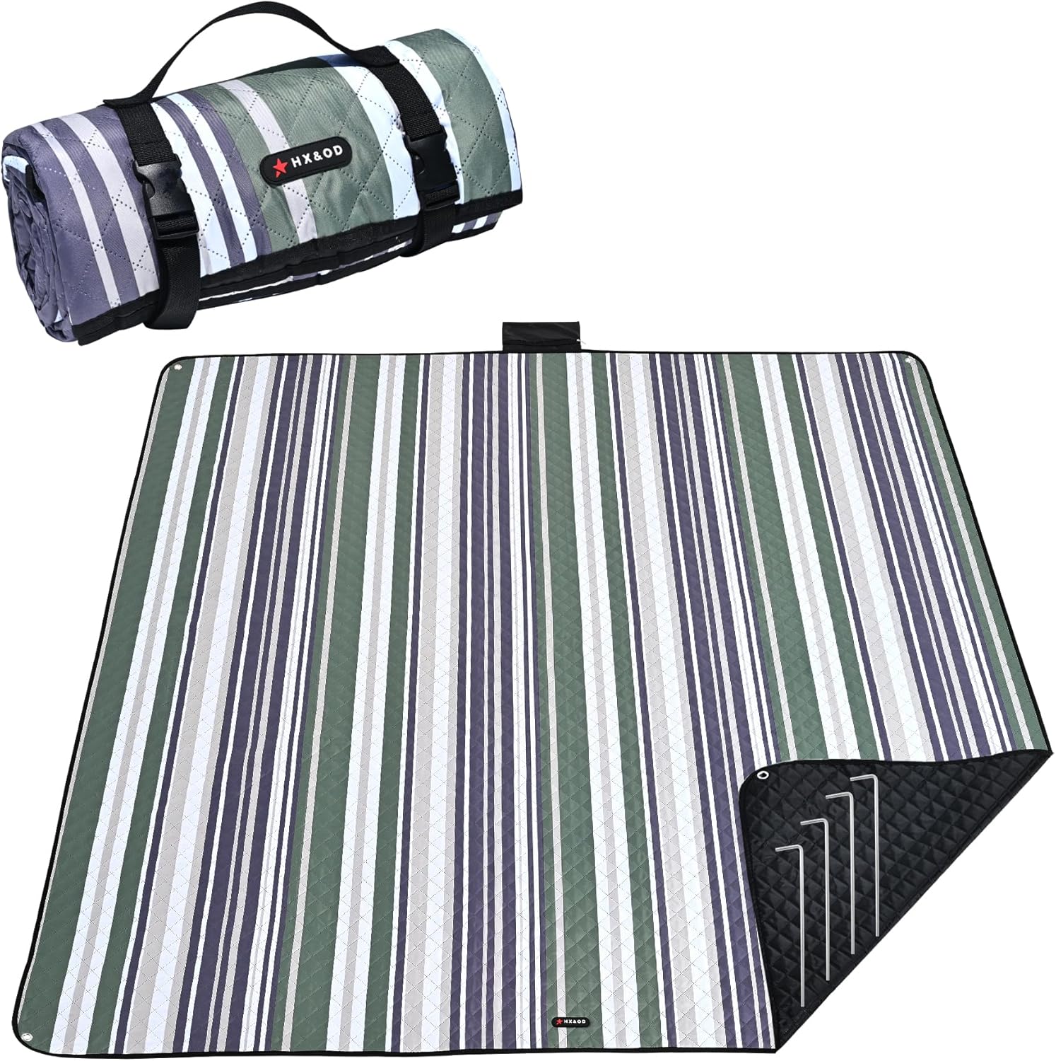 HX&OD Outdoor Picnic Blanket Extra Large, 80''*60'' Waterproof Picnic Mat with Stakes Foldable Camping Blanket Portable with Carry Strap for Beach Mat (Green& White, 80''*60'')