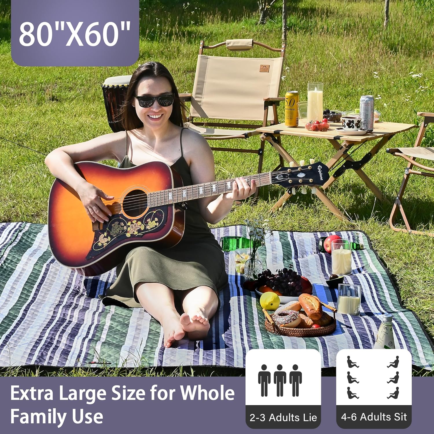 - ☀ 【Large size, Portable & Lightweight】- Our Picnic blankets unfoldedsize is 80''x 60''. It’s large enough to fit for 4-6 adults for siting, giving your children and pets a large area to play. This is a windproof picnic mat. Comes with ground spikes to keep the picnic mat from blowing up. Can be used in all seasons.