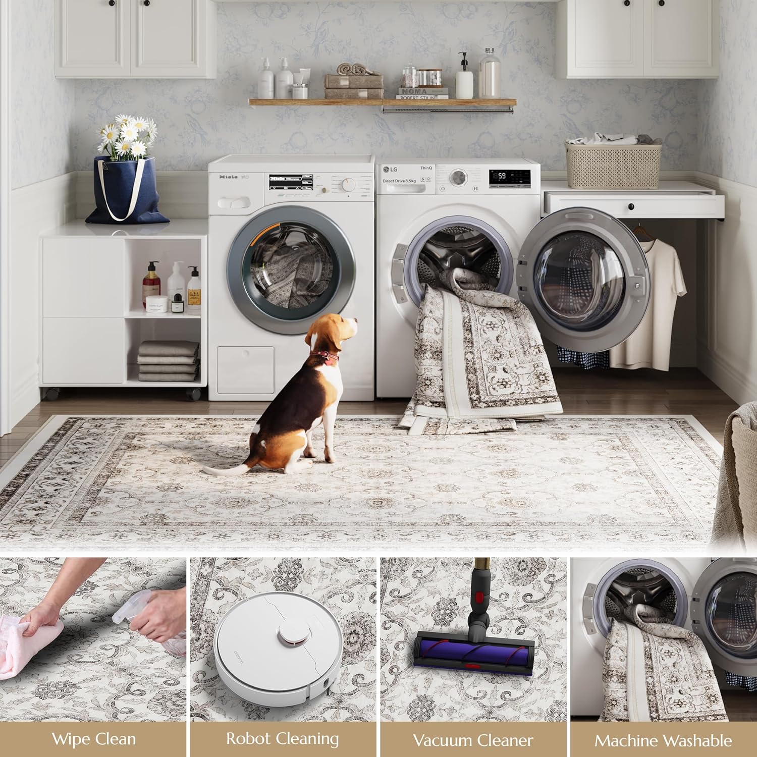 jinchan Round Rug 8ft Washable Circle Soft Rug - Low Pile Vintage 8'Round Indoor Beige Floral Print Stain Resistant Boho Carpet Ultra-Thin Non-Slip for Living Room Bedroom Dining Room Kitchen