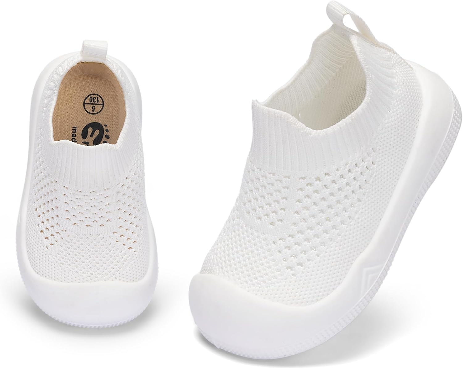 - Easy Put On:Baby walking shoes The one-piece design with stretchy knit collar only takes seconds to for you to slip them on, so babies can jump right into playtime. Toddler slip on shoes let them play in comfort while enjoying their time.
