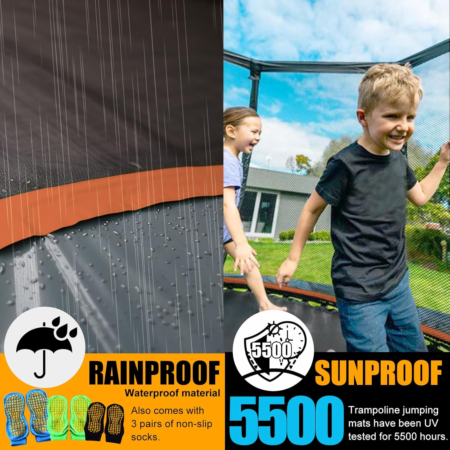 - Upgraded Premium Material Made: The outdoor kids trampoline is equipped with thick and waterproof spring cover pads for enhanced safety and longevity. Warning circle design marks the safety range. The reinforced jumping mat boasts UV resistance.