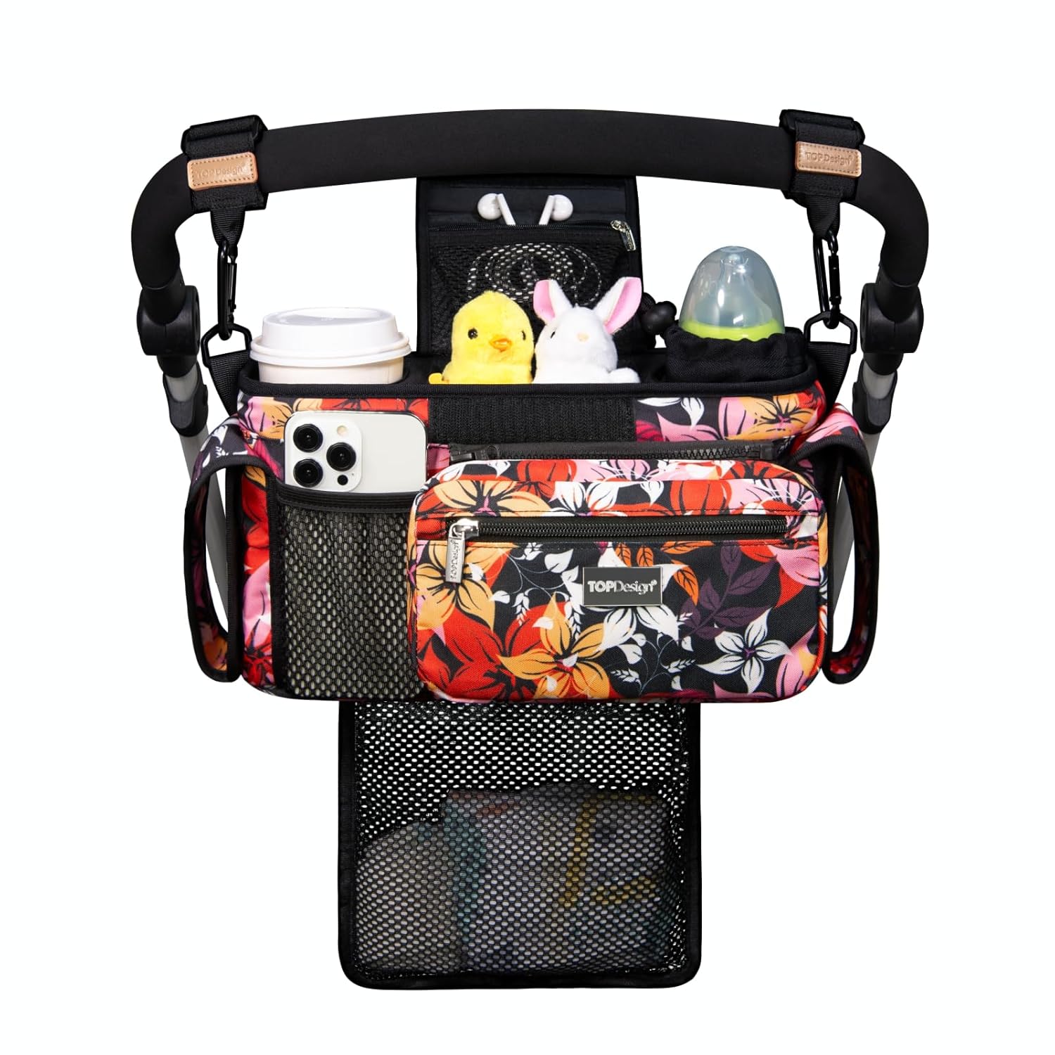 TOPDesign Universal Baby Stroller Organizer, Stroller Caddy with Detachable Mesh Bag & Heightened Insulated Cup Holders & Non-Slip Secure Hooks Accessories, Fits Most Strollers (Five Petal Flower)
