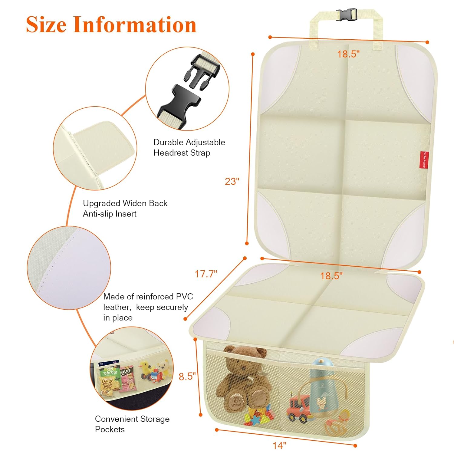 - MULTIFUNCTIONAL UNIVERSAL CAR SEAT COVERS: Our child car seat protector fits under any rear or forward-facing child car seat or booster. The large size makes it compatible with most types of cars, trucks, vans, SUVs, ect. The car seat covers also offer extra storage pockets for storing toys, food, bottles, and other items while you're on the road