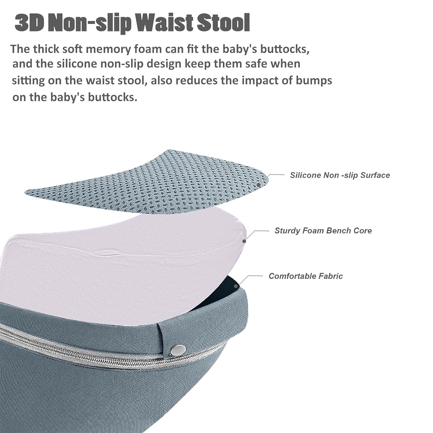 - Ergonomic Hip Seat: The waist stool maintains the baby's M-shape during carrying, helping their skeletal development. The wide waistband make the hip seat to fit snugly against the parent's waist, helping to share the weight during carrying baby. The inward sloping angle of the hip seat keeps the baby close to the parent's body comfortably and reduces bumps and shaking when parents walking. Besides, it make baby feel safety in their arms.