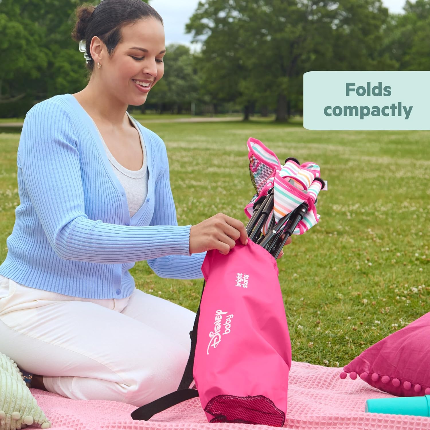 - Compact design easily folds to 5 x 15 inches; easy to clean with dishwasher safe tray and machine washable seat pad; includes a rear storage pocket for little essentials
