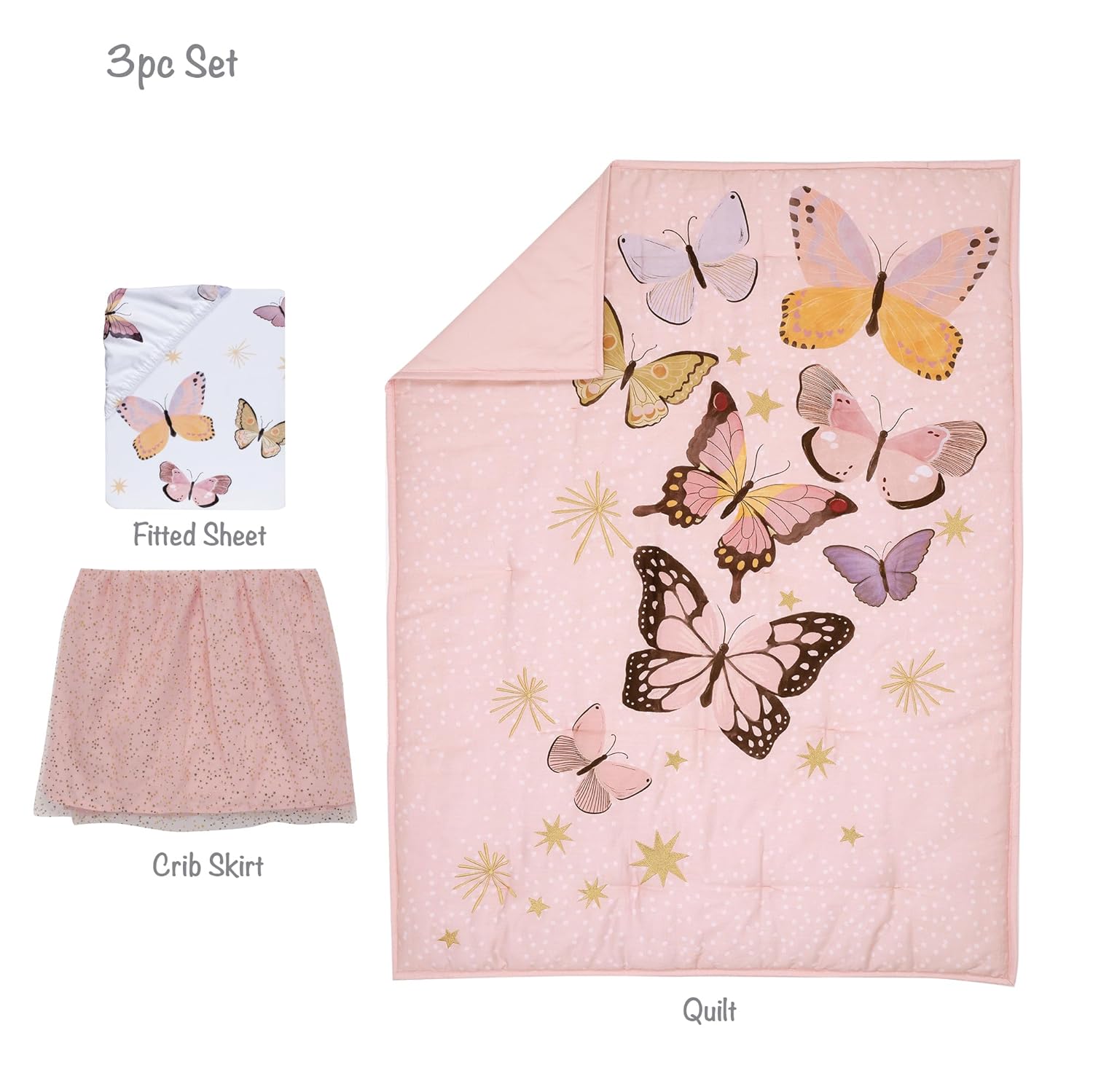- 3 piece bedding set includes one quilt, one breathable 100% cotton fitted crib sheet, and one sparkling double layer crib skirt
