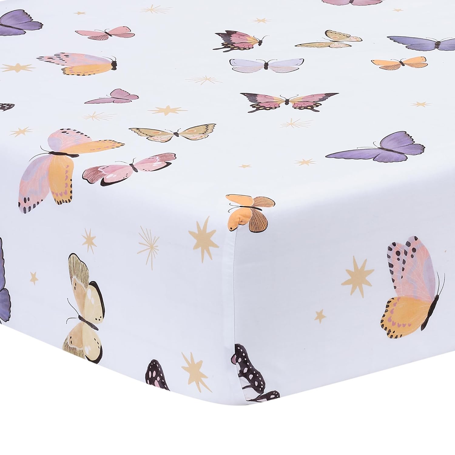 - Breathable 100% cotton fitted crib sheet has a kaleidoscope of colorful butterflies