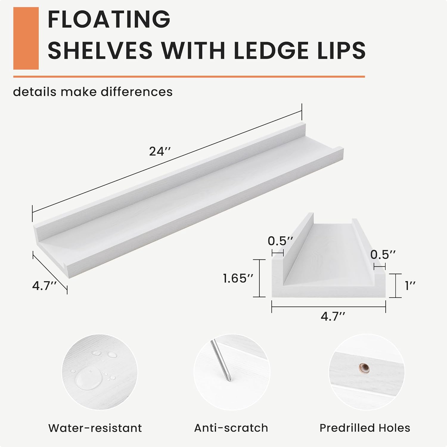 Solid Ash Wood Picture Ledge Shelf, 24 Inch Floating Shelves with Lip Set of 2, Photo Ledge Shelf Nursery Bookshelf Wall Mounted for Living Room Bedroom Decor, White