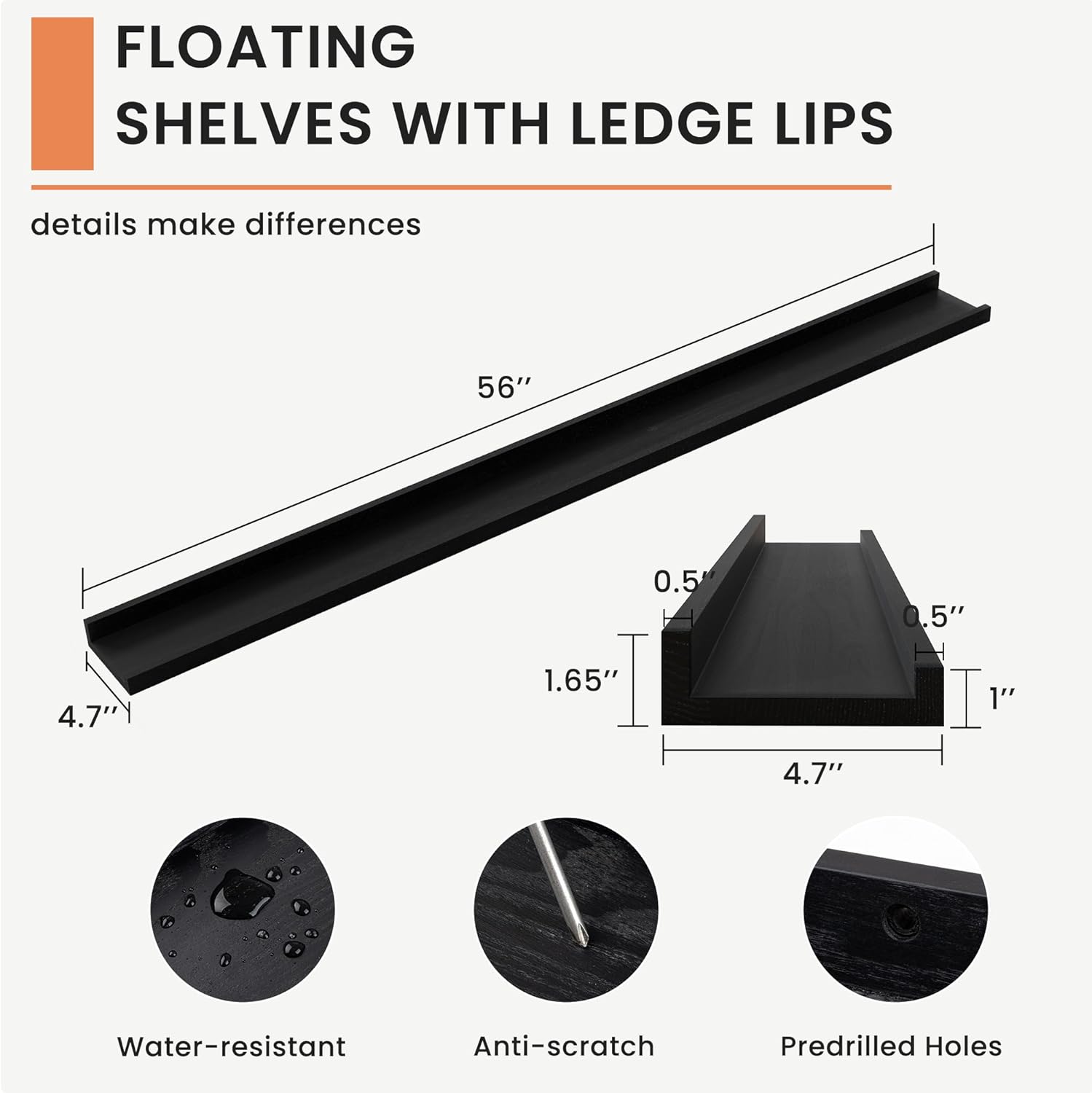 Solid Ash Wood Picture Ledge Shelf, Floating Shelves Set of 2, 56 Inch Long Large Ledge Shelves, Nursery Book Shelves Wall Mounted for Living Room Bedroom Kitchen Decor Kids Bookshelf, Black
