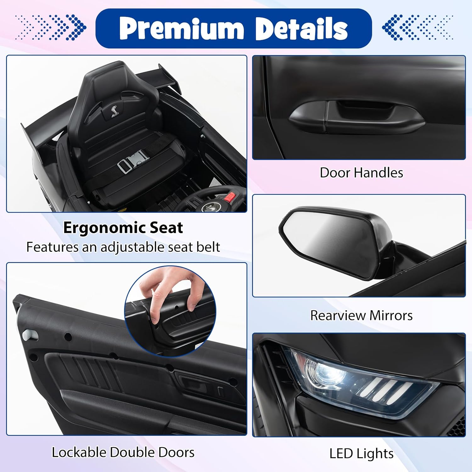 Costzon Ride on Car, 12V Licensed Ford Mustang Shelby GT500 Kids' Electric Vehicles w/Remote Control, USB Port, Radio, Music, Player, High Low Speed & Soft Start, Racing Kids Car for Toddler (Black)