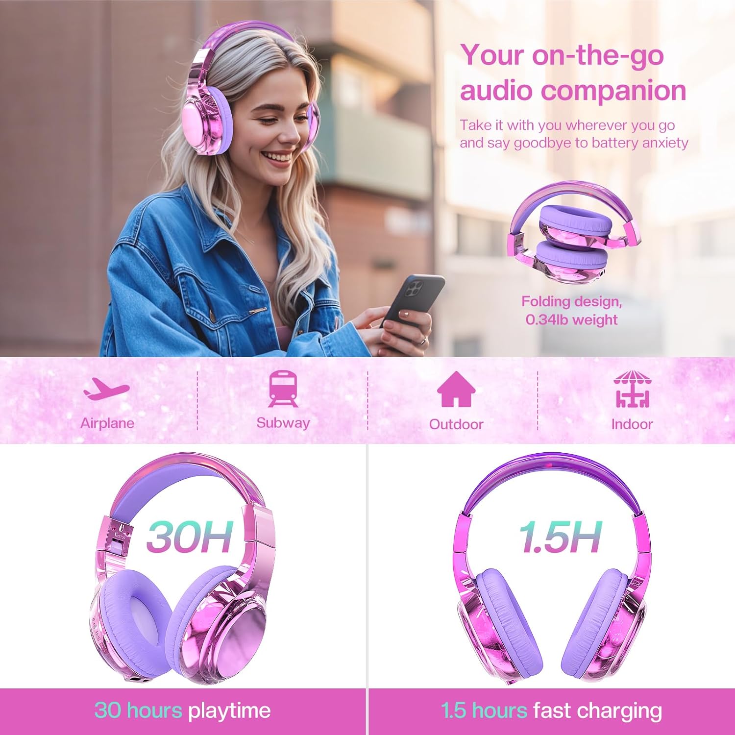 - 30-Hour Battery Life & Portable Foldable Design:With up to 30 hours of playtime and USB-C fast charging, these headphones eliminate battery anxiety, making them perfect for long flights, train journeys, or daily commutes on the subway. The foldable design and lightweight construction (only 0.34lb) make them easy to carry and store, whether your child is heading to school, the library, or the park.
