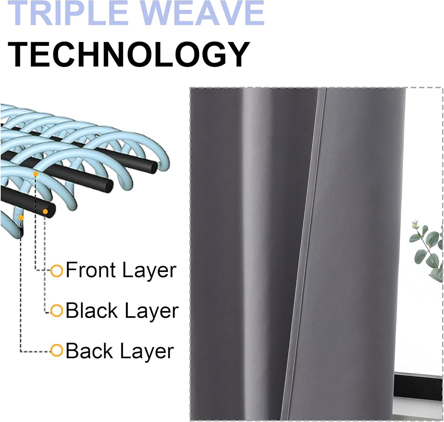 - High-Quality Materials: Crafted from high-quality polyester fiber, guarantee both stiffness and drape. This soft yet durable light-blocking fabric boasts a three-layer weave, with a middle layer of black yarn acting as an effective light-blocking panel, effectively blocking light while providing privacy. The identical colors on both sides further enhance its aesthetic appeal, adding a touch of elegance to your home.