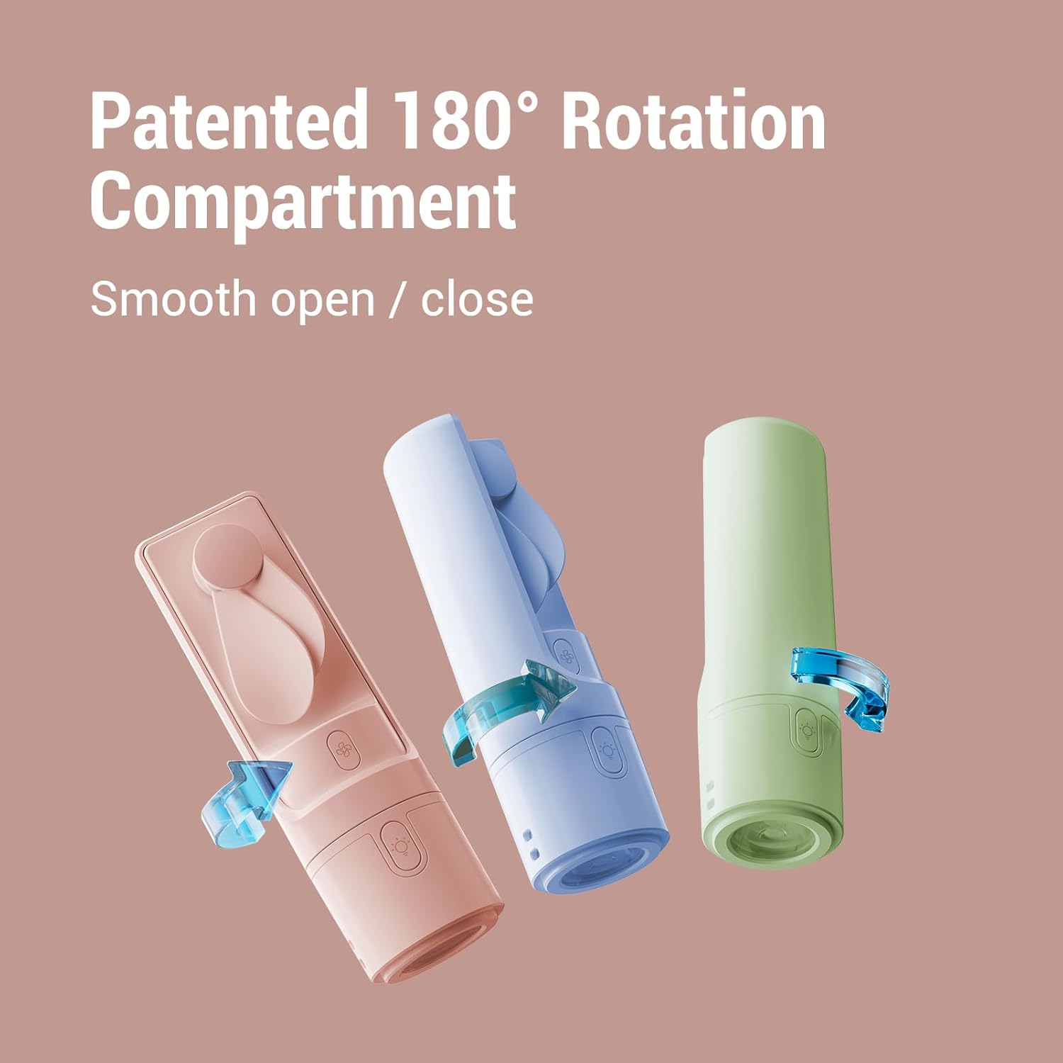 - Innovative 180-Degree Rotating Cover Design: Airluxe mini patented design, allowing it to open smoothly in either a clockwise or anti-clockwise direction. This design removes the need to pry or struggle to open, prevents the fan blades from getting pinched, and keeps the power button protected.