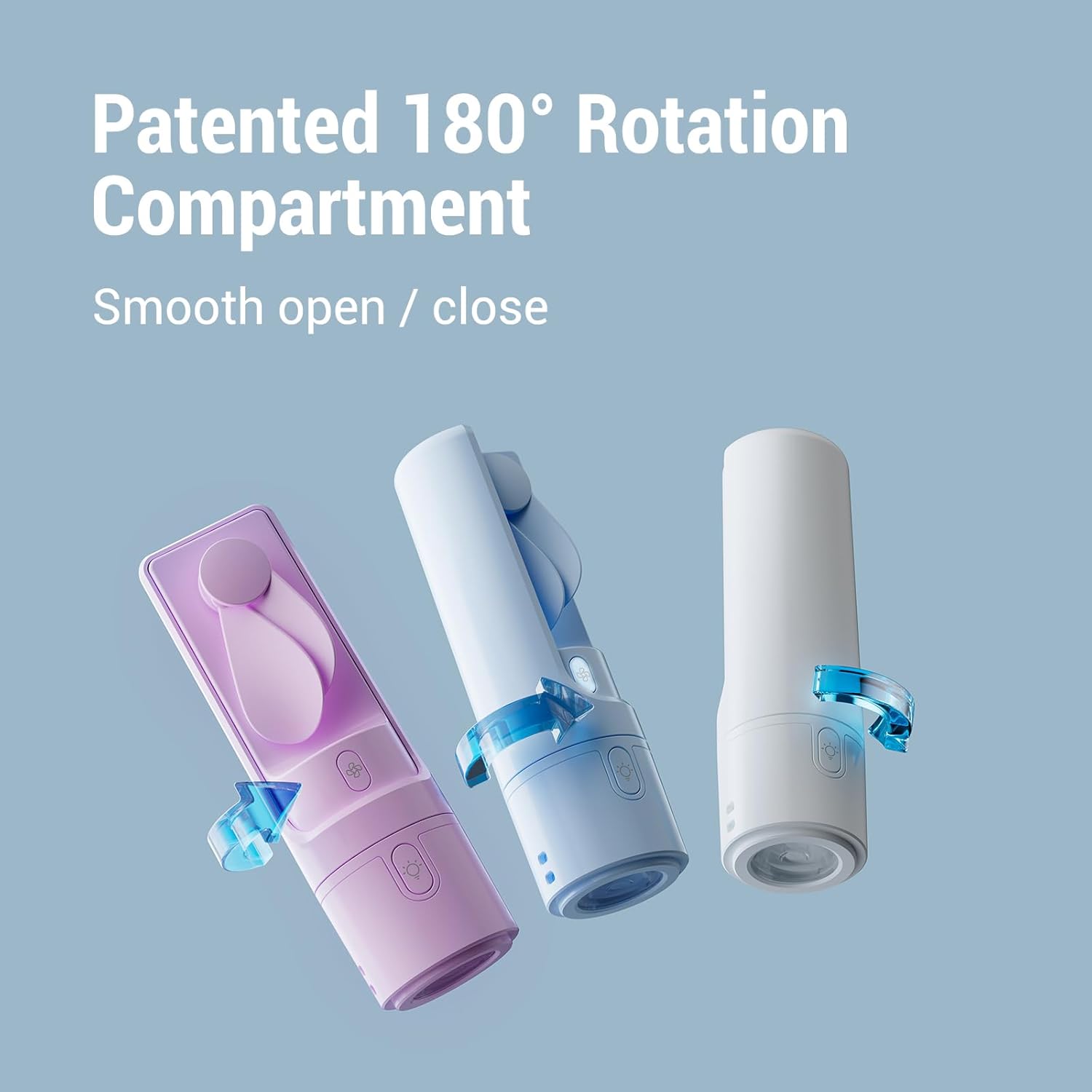 - Innovative 180-Degree Rotating Cover Design: Airluxe mini patented design, allowing it to open smoothly in either a clockwise or anti-clockwise direction. This design removes the need to pry or struggle to open, prevents the fan blades from getting pinched, and keeps the power button protected.
