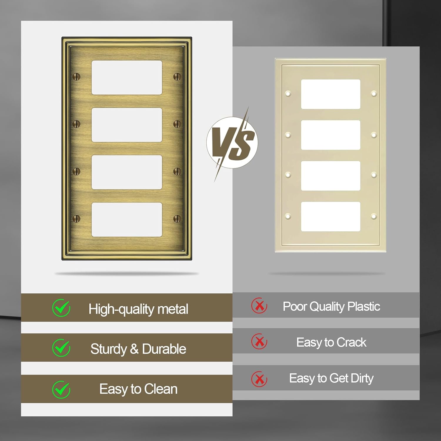 2 Pack Quad Decorator Switch Covers Wall Plate, Antique Brass Metal Material Rocker Switch Plates, 4 Gang Wall Plate for Receptacle, GFCI Outlet, Dimmer Switch - Classic Style