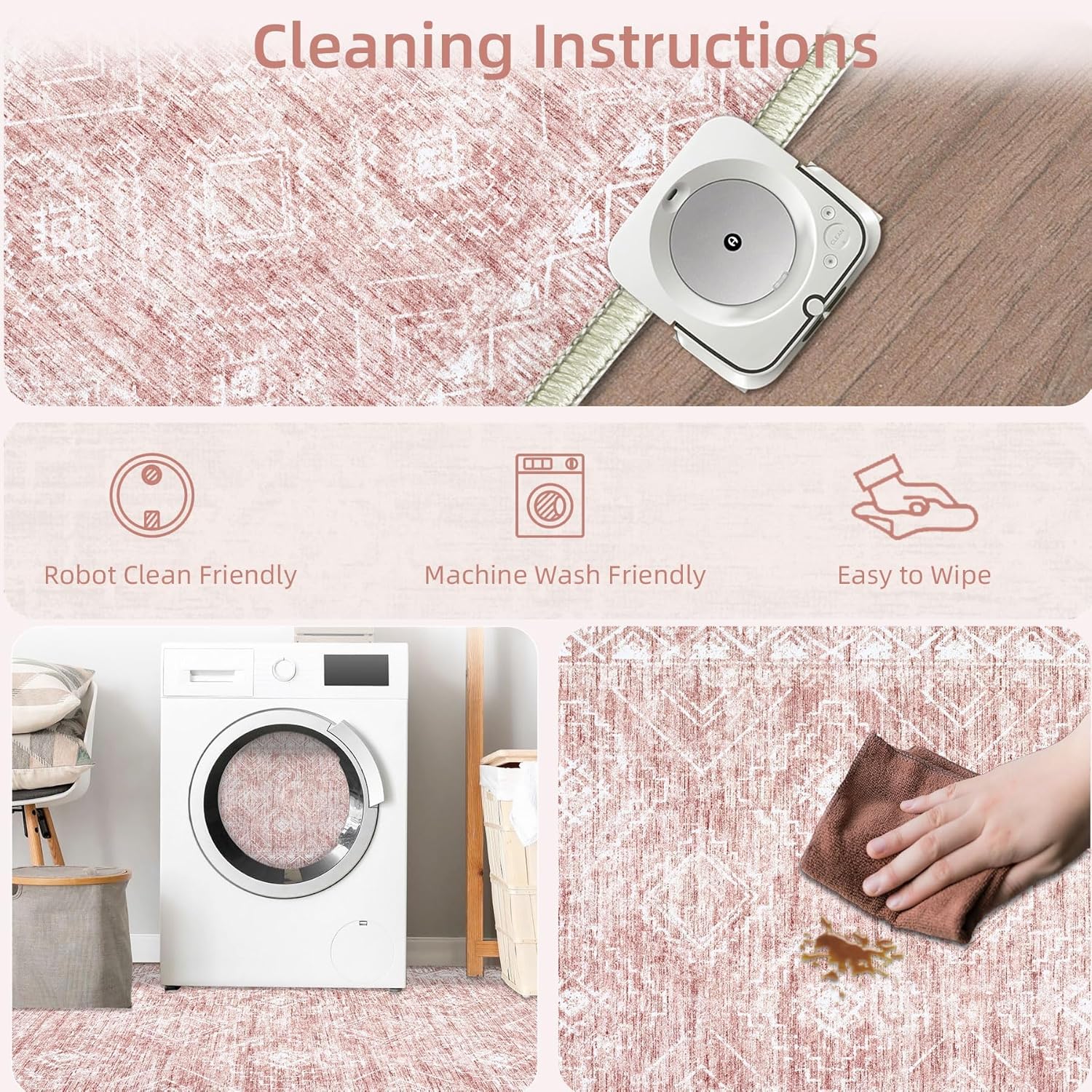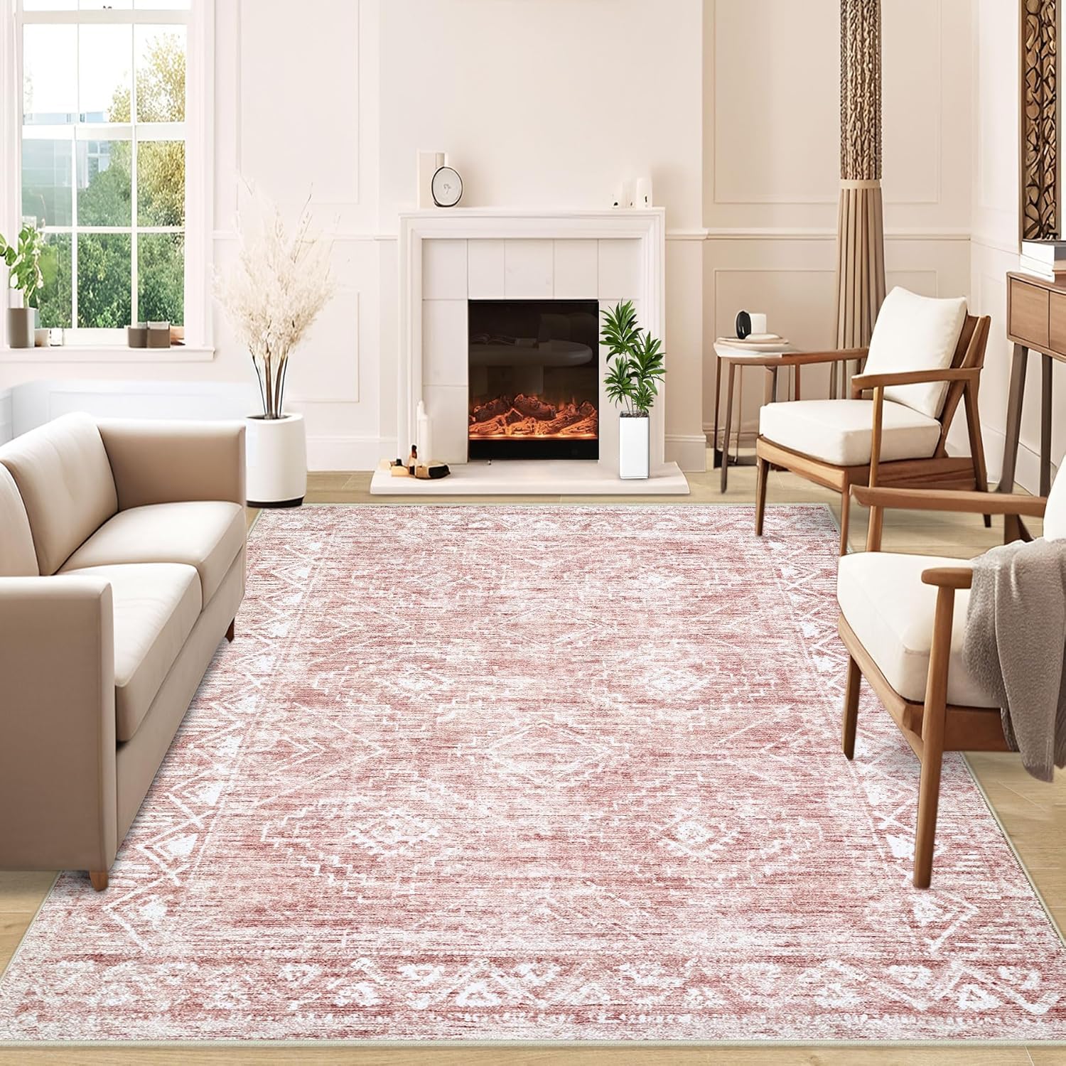 Large Living Room Area Rug 9x12 - Machine Washable Vintage Boho Moroccan Rugs Geometric Neutral Rug Non-Shedding Low Pile Distressed Farmhouse Carpet for Bedroom Nursery Classroom Dorm(9'x12',Pink)