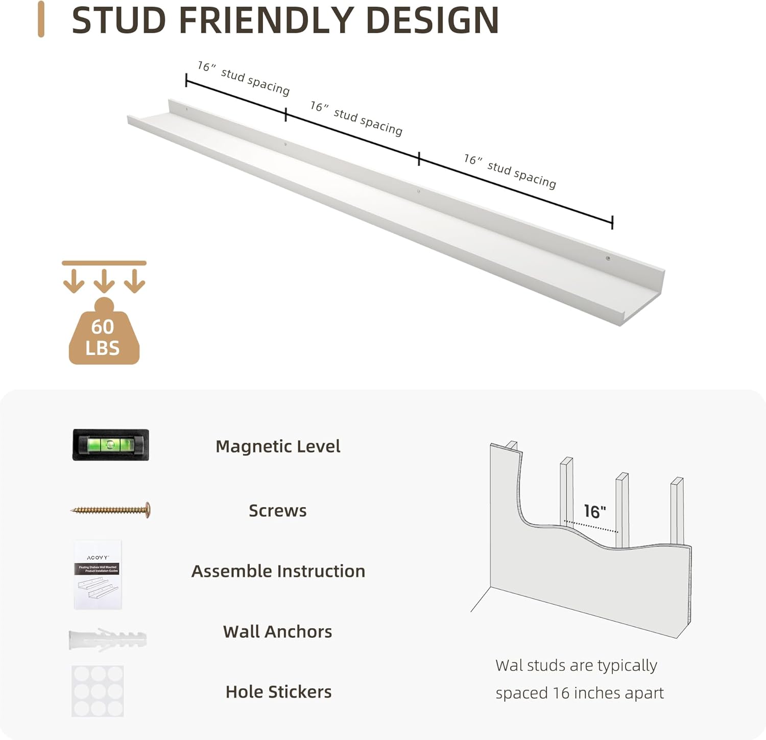 Picture Ledge Shelf, Wood Long Floating Shelves for Wall, Set of 2, 56 inch Picture Ledge Shelves, Photo Ledge Nursery Book Shelves Wall Mounted for Living Room Kids' Room Bedroom, Color White