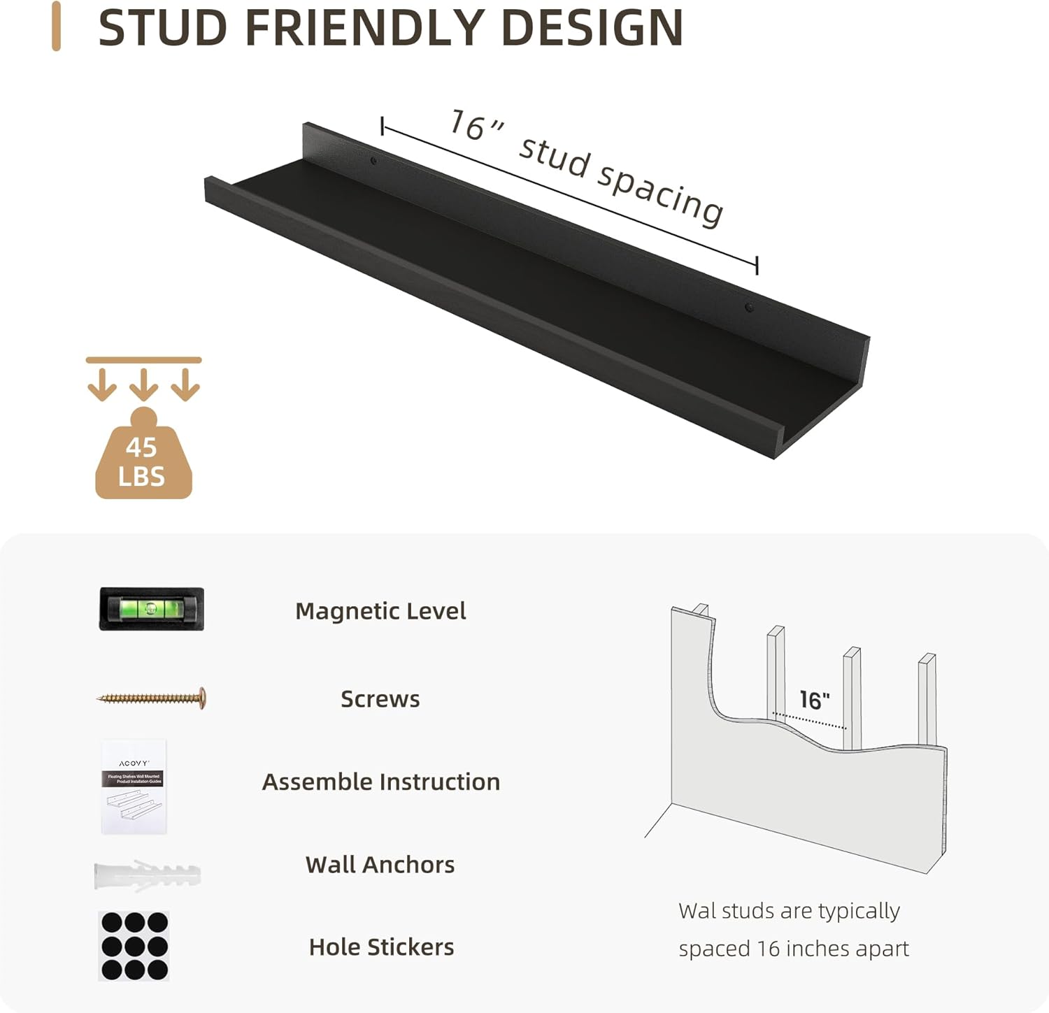 - ăSuperior Qualityă Crafted from high-quality wood, each floating shelf is designed for long-lasting durability. The pre-drilled mounting holes are spaced 16 inches apart, ensuring a secure installation into wall studs.