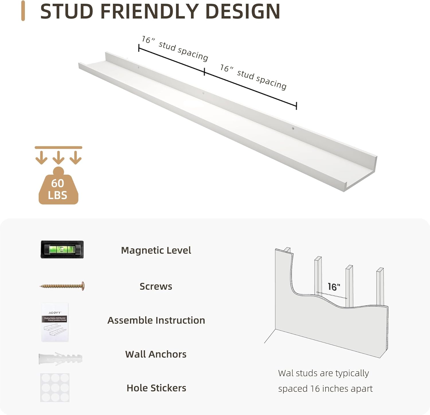 Picture Ledge Shelf, Wood Long Floating Shelves for Wall, Set of 2, 48 inch Picture Ledge Shelves, Photo Ledge Nursery Book Shelves Wall Mounted for Living Room Kids' Room Bedroom, Color White