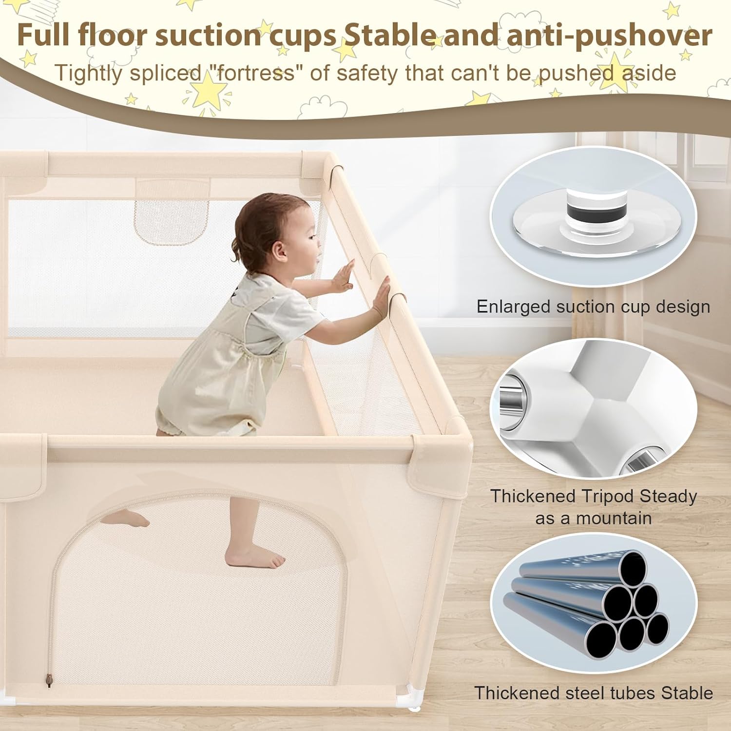 - 【EXTRA-LARGE FREE-MOVEMENT PLAY SPACE】Abdtech play yard for baby provides an oversized 50*50/71*59/79*71 inches play area for infants and toddlers, which allows children to play to their heart's content, learn how to move independently, and explore and perceive the world. The scientific height of the baby play yard is designed to help babies train to stand and walk, and babies can move freely in the large playpen for babies and toddlers without rolling out, safe and reliable.