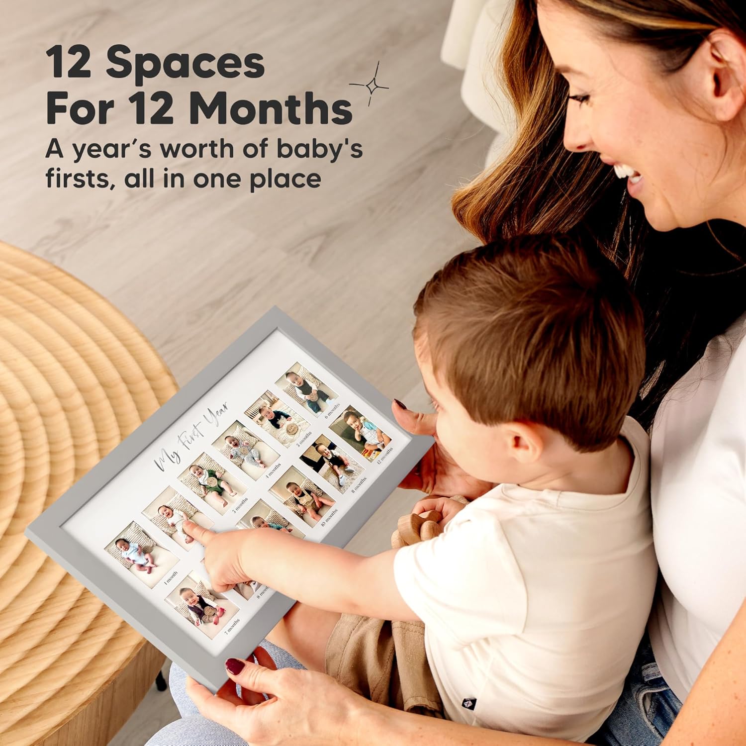My First Year Photo Frame,12 Months Baby Picture Frame for Newborn Girl, Boy-Baby Shower Gifts Keepsakes,Monthly Baby's One Year Birthday Milestone,1st Nursery Photo Collage Display Board (Cloud Gray)