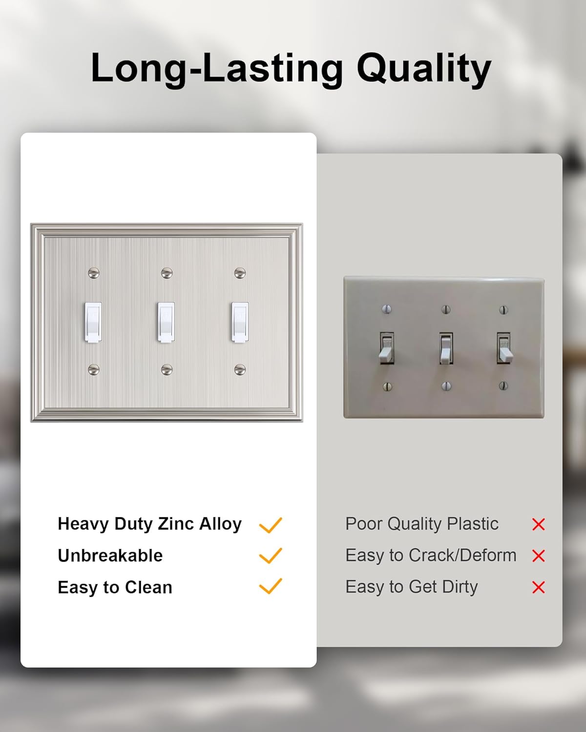 - Durable Solid Zinc Alloy - Constructed from thick and sturdy zinc alloy, the triple light switch cover plate offers exceptional durability and sturdiness, easier to clean and maintain. It is resistant to high impact, tarnishing, and corrosion, unbreakable. Ensuring it remains its stunning appearance for years to come.