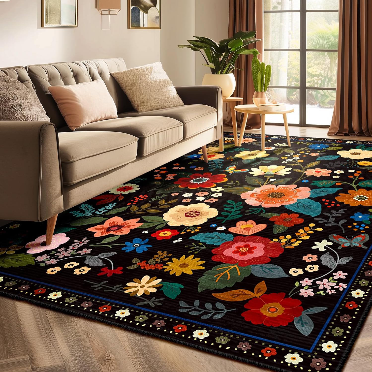 Floral 3x5 Area Rug Machine Washable Soft Print Boho Carpet Non Slip Doormat Low Pile Flower Area Rugs for Living Room Bedroom Nursery Kitchen Dining Room Indoor-Black