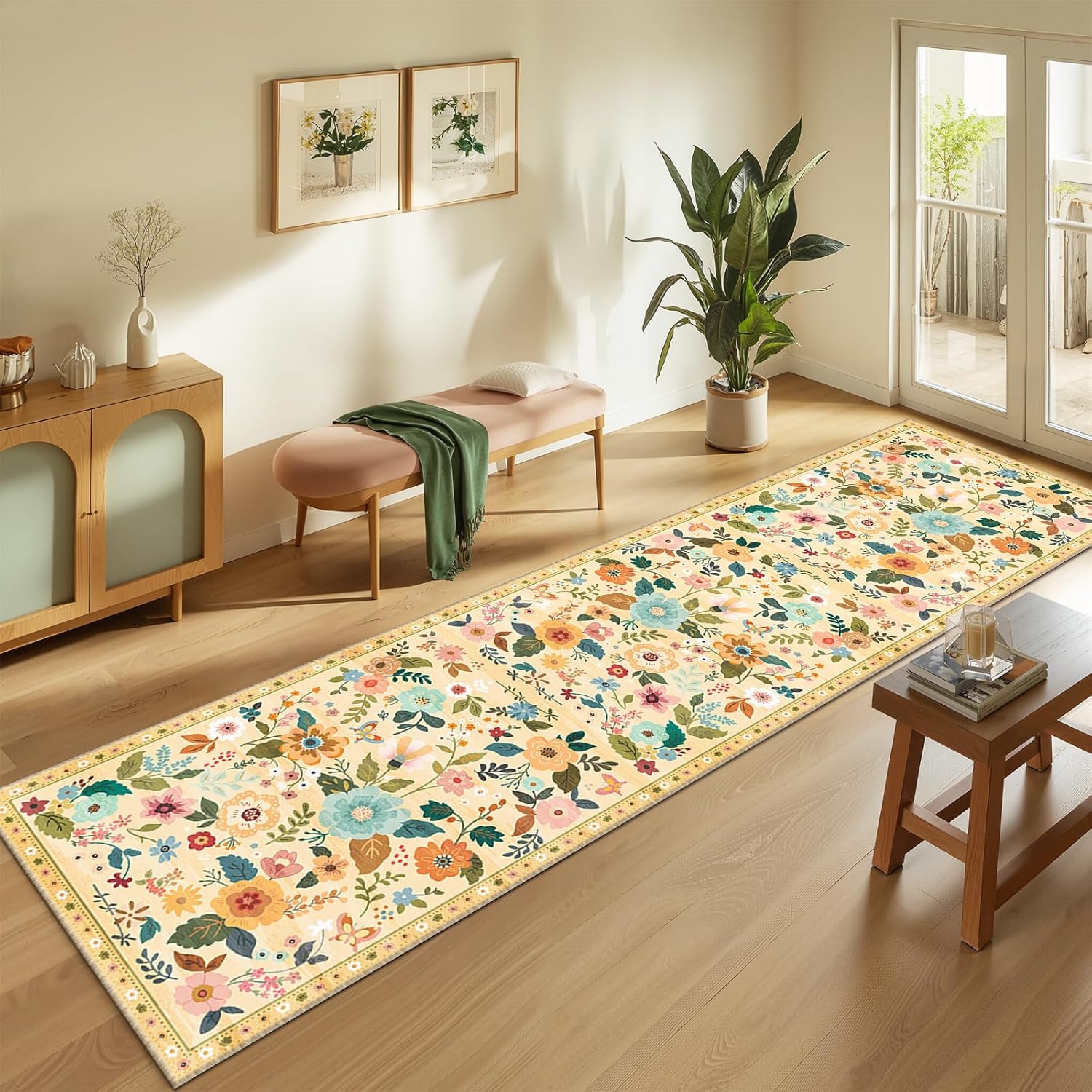 Floral 2x10 Area Rug Machine Washable Soft Print Boho Carpet Non Slip Doormat Low Pile Flower Area Rugs for Living Room Bedroom Nursery Kitchen Dining Room Indoor-Ivory/Yellow