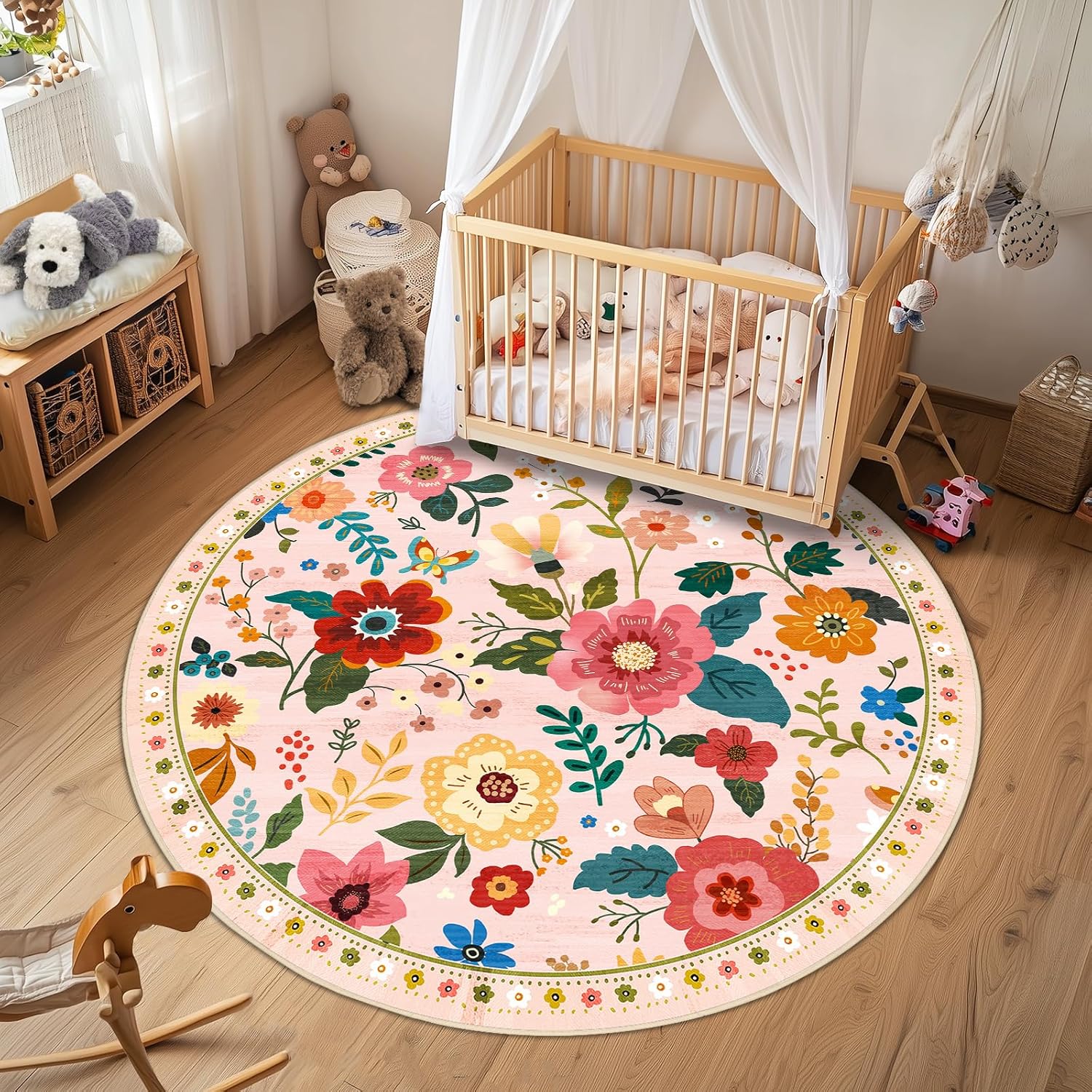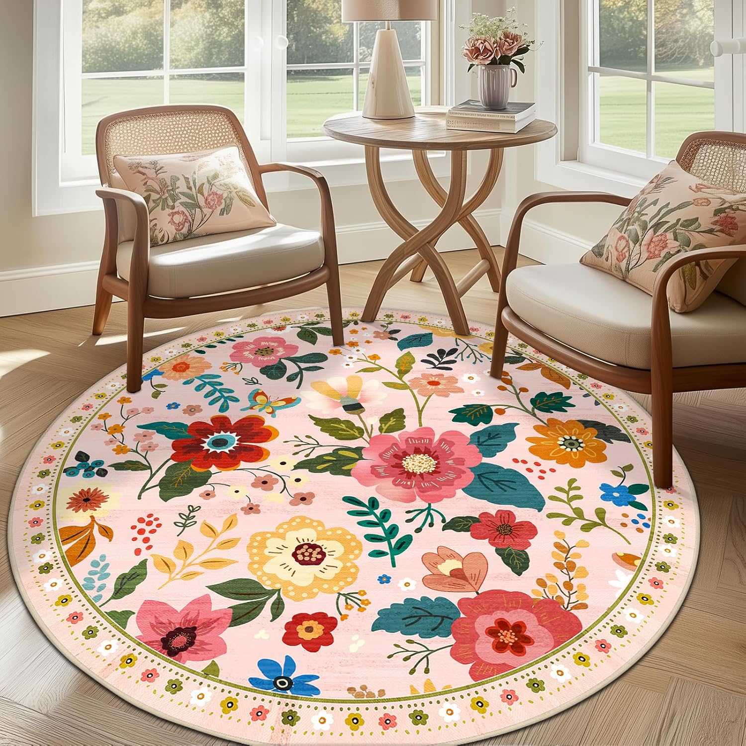 - Machine Washable:The round rug are machine washable,allowing for both machine wash and hand wash options.It is recommended to wash them in cold water.This floral rug is crafted with a low pile that won’t block opening and closing doors, make machine wash possible.Small stains can be blotted with a rag,soft-bristled brush,vacuum,or robotic vacuum cleaner.Avoid using bleach and high-temperature ironing