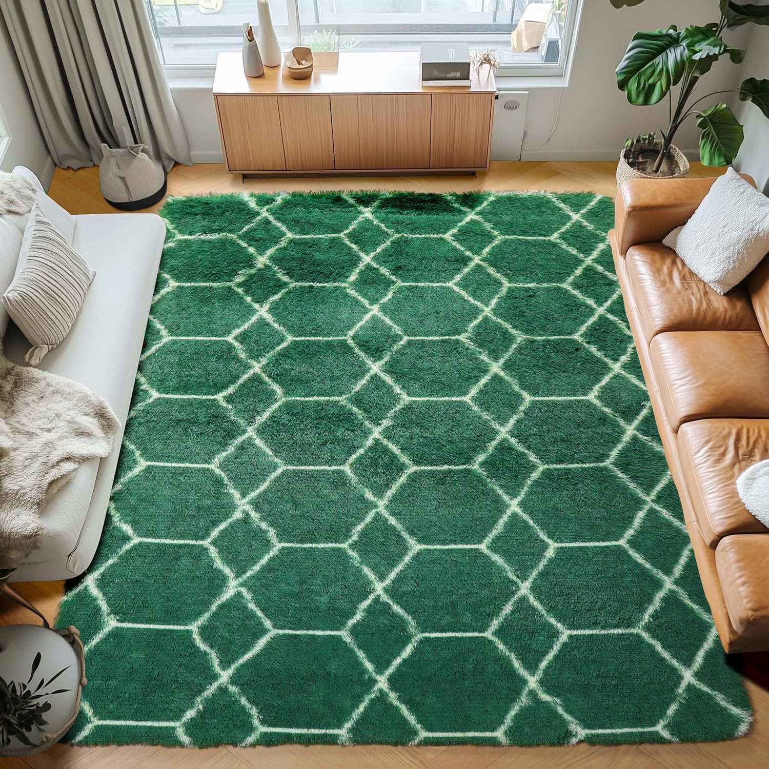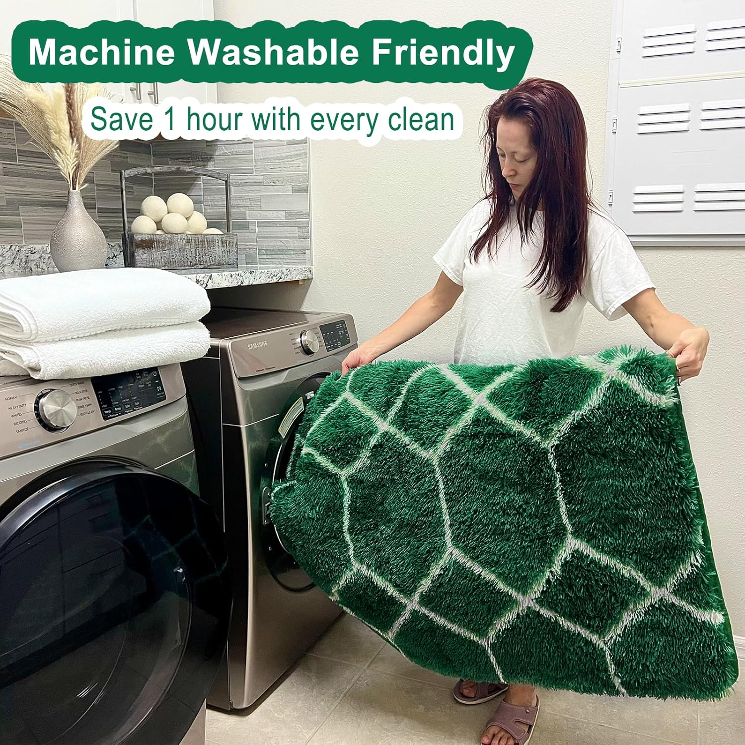 ONASAR Area Rugs for Living Room Bedroom, 5x8 Washable Fluffy Dark Green and White Rug, Geometric Boho Soft Plush Shaggy Fuzzy Floor Carpet for Nursery Kids Girls Boys Teen Dorm Home Decor Aesthetic