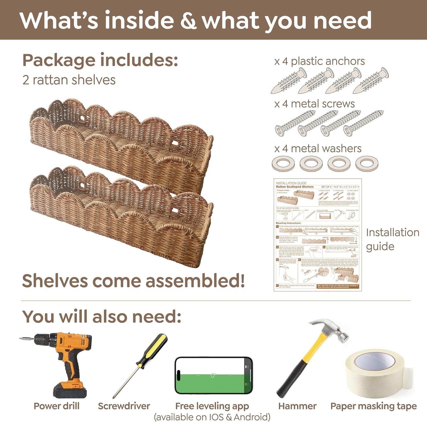Nursery Book Shelves Set of 2 - Artisanal Natural Rattan Scalloped Book Shelf for Kids Rooms 15.8" W, Cute Wicker Nursery Bookshelf Wall Mounted, Handwoven Floating Kids Bookshelf, Baby Boho Decor